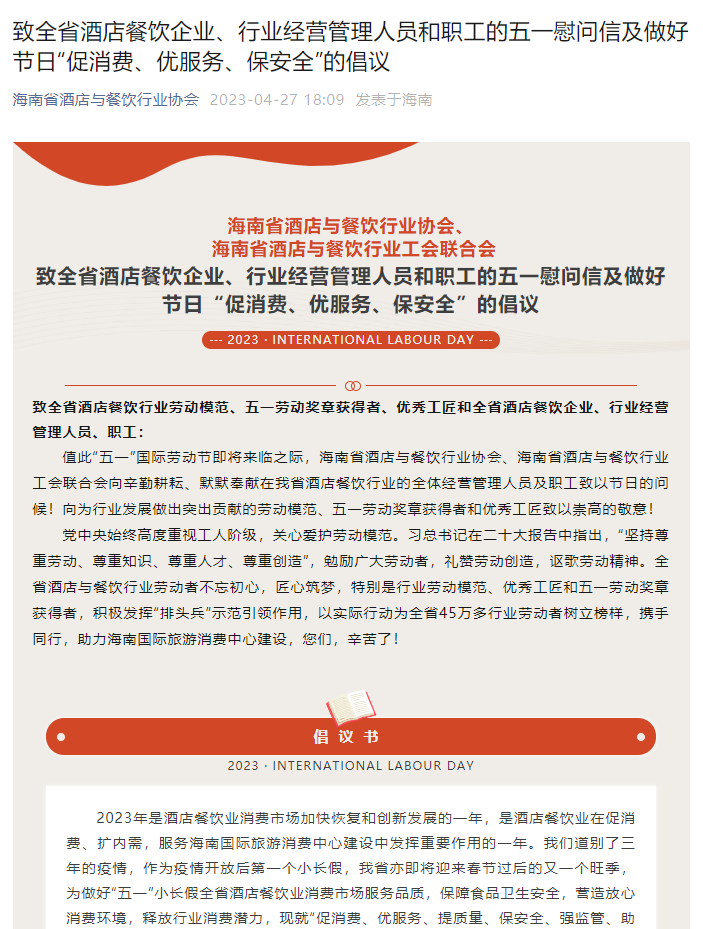 海南省酒店与餐饮行业协会、海南省酒店与餐饮行业工会联合会发布致全省酒店餐饮企业、行业经营管理人员和职工的五一慰问信及做好节日“促消费、优服务、保安全”的倡议。