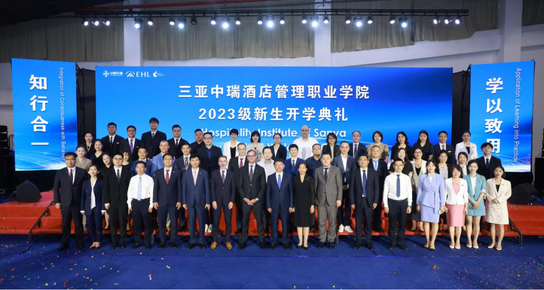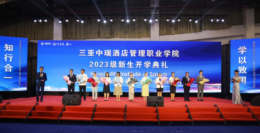 瑞士洛桑酒店管理学院(EHL集团)首席执行官马库斯·维赞教授,首席学术官胡安·佩雷洛博士,大中华区首席董事鲍琛,大中华区董事封官禄,大中华区执行顾问梁辰倩,三亚市海棠区委常委、区政府副区长施能艺,三亚市教育局副局长陈小冬,三亚市投资促进局副局长左戍,中交海南区域总部总经理、中交海投党委书记、董事长由广君,中交海南区域总部执行总经理、中交海投党委副书记、总经理周济,中交海南区域总部执行总经理、中交海投党委委员刘彦,海南省酒店与餐饮行业协会执行会长陈恒,三亚艾迪逊酒店总经理袁海华,三亚亚龙湾喜来登度假酒店总经理Daniel Roland Meier,海口希尔顿酒店总经理丁振宇,三亚山海天JW万豪酒店&山海天大酒店、傲途格精选总经理Ulf Pauschardt,三亚保利瑰丽酒店董事总经理钮则雄,三亚珊瑚湾文华东方度假酒店总经理余露,三亚海棠湾天房洲际度假酒店总经理王诤言,三亚海棠湾红树林度假酒店总经理沈伟,三亚海棠湾茅台度假村总经理周志军,三亚亚特兰蒂斯酒店人力资源副总裁杨萱,海南清水湾威珀斯度假酒店副总经理彭飞,海南蜈支洲旅游开发股份有限公司三亚蜈支洲岛旅游区集团副总裁冯超,海南南山文化旅游开发有限公司总经理刘春立,以及海南土福湾嘉佩乐度假酒店、三亚太阳湾柏悦酒店、三亚理文索菲特度假酒店、三亚海棠湾JW万豪&喜来登度假酒店、三亚海棠湾民生威斯汀度假酒店、三亚亚龙湾瑞吉度假酒店、三亚泰康之家度假酒店·臻品之选、三亚千古情旅游演艺有限公司等酒店与旅游业界的企业嘉宾参加了开学典礼。
