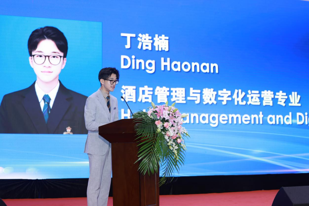 维赞致辞后,目前在三亚太阳湾柏悦酒店任职的校友牛舒萱上台向他致谢,也向EHL集团为三亚中瑞提供学术指导的教师团队致敬。