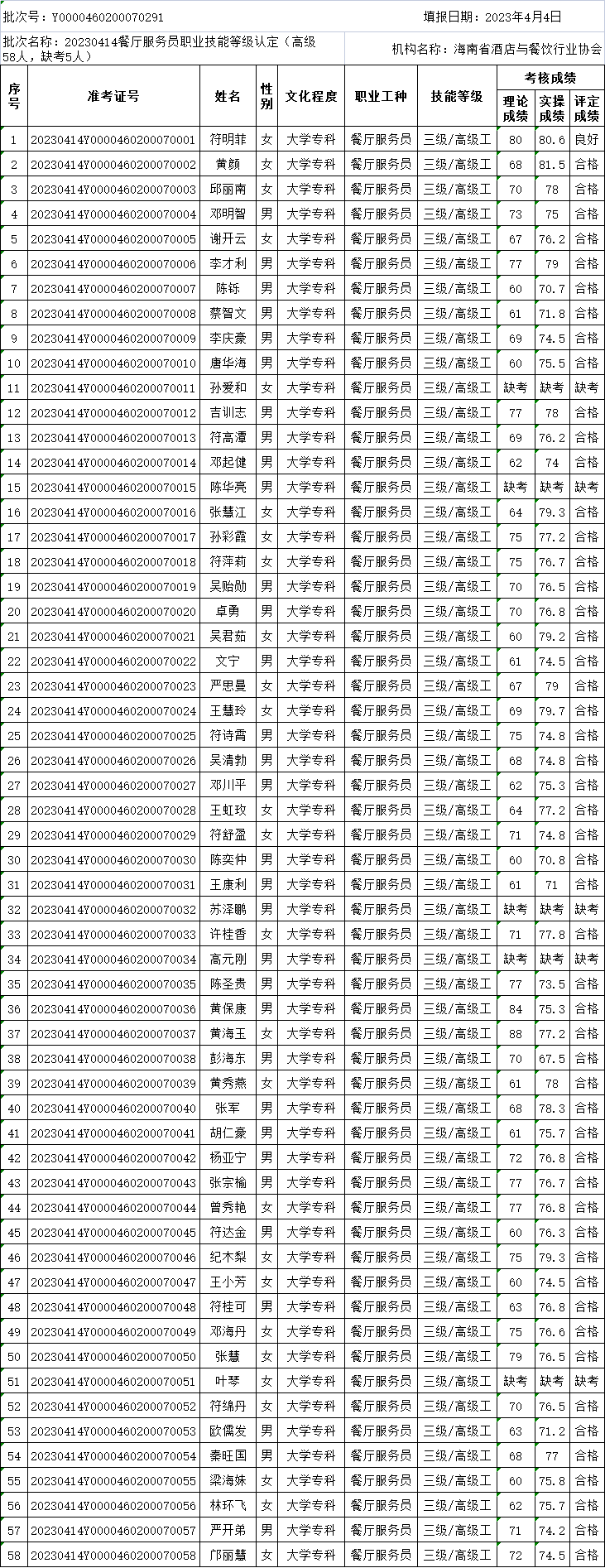 海南省酒店与餐饮行业协会职业技能等级认定成绩公示