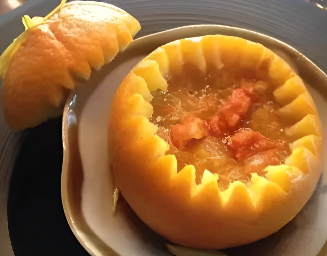 选当季成熟的大橙子,把顶部四分之一处切下,留用毋弃,挖掉内瓤(剜橙肉时用剪刀剪断橙瓣筋膜),保留一些橙汁;挑选优质阳澄湖大闸蟹,剔取蟹黄、蟹肉,并肥膘丁、荸荠、蛋液、姜末、料酒、醋、盐等放到挖空的橙子中,用切下的橙子顶部盖好,封口;然后放到蒸锅或笼屉里,约蒸30分钟,即成上席。