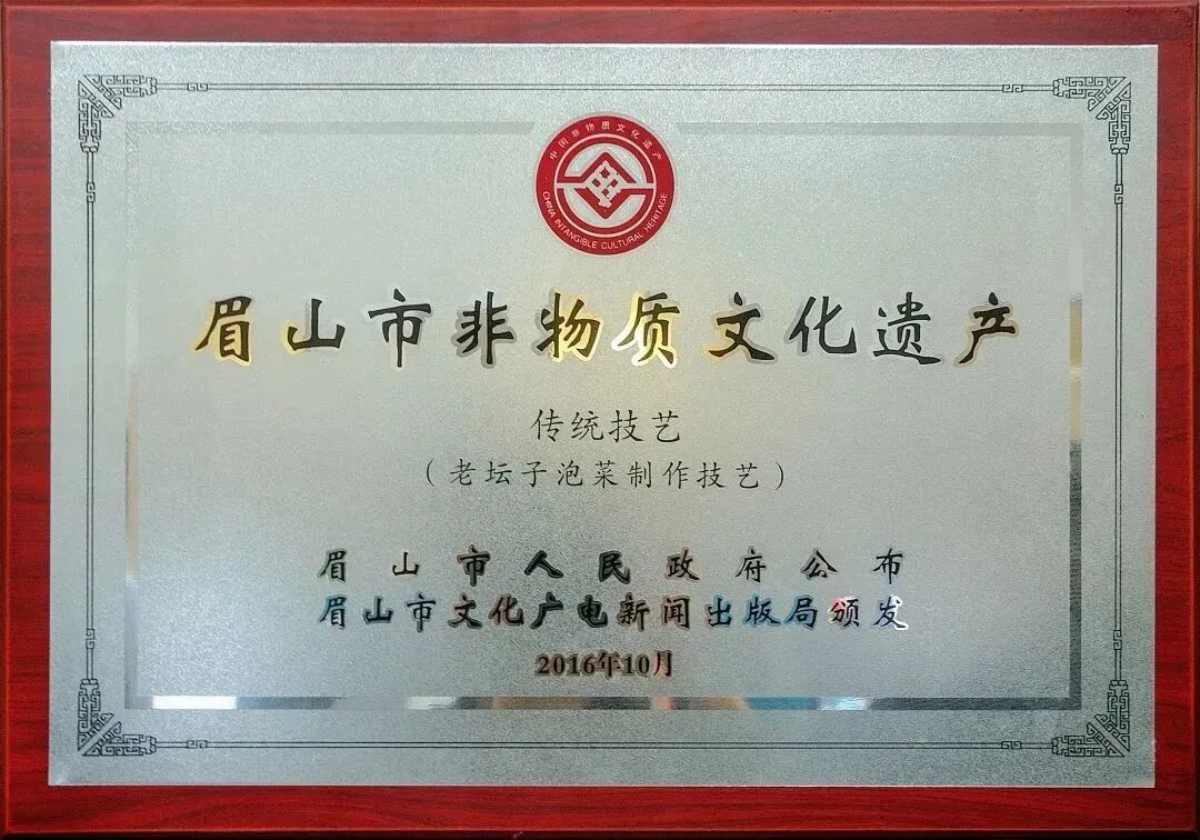 “老坛子泡菜制作技艺”起源于1902年。第四代传承人何艳平于2010年成立了“四川老坛子食品有限公司”,2021年被确定为省级非遗代表性传承人。2019年7月,公司被四川省文化和旅游厅授予“四川省非物质文化遗产项目体验基地”。2020年12月被市教体局和市文广旅授予“眉山市中小学生研学实践教育基地”。