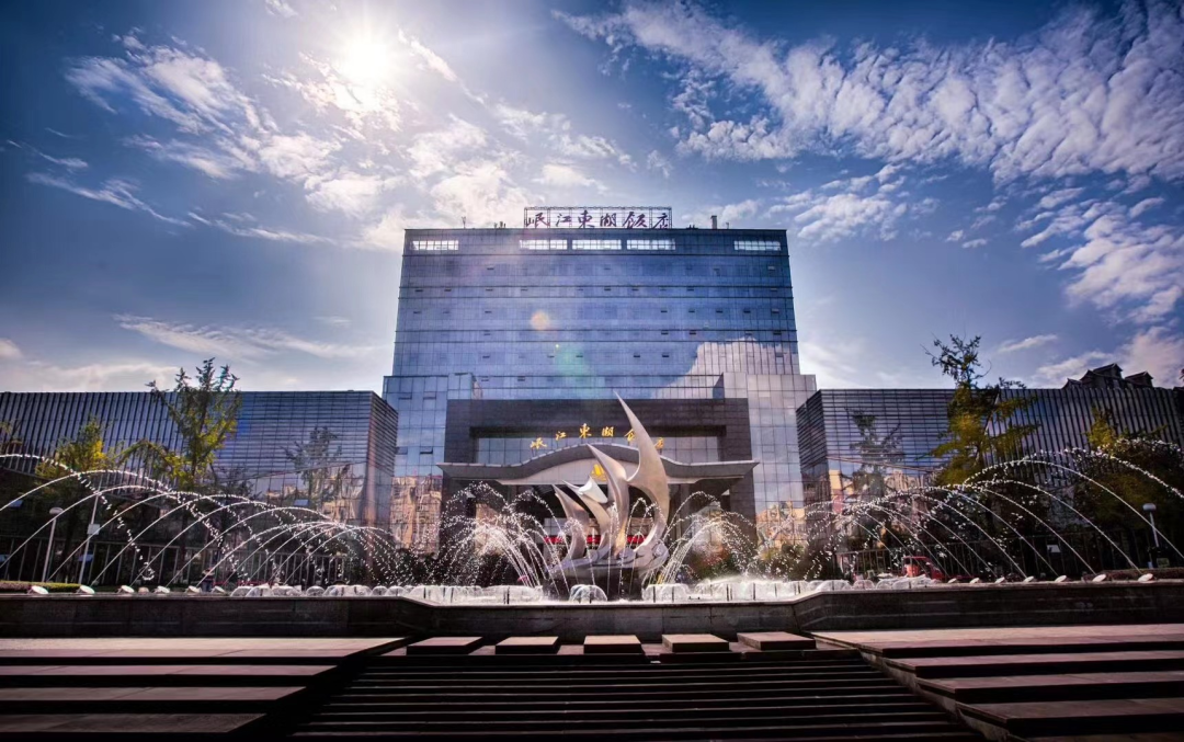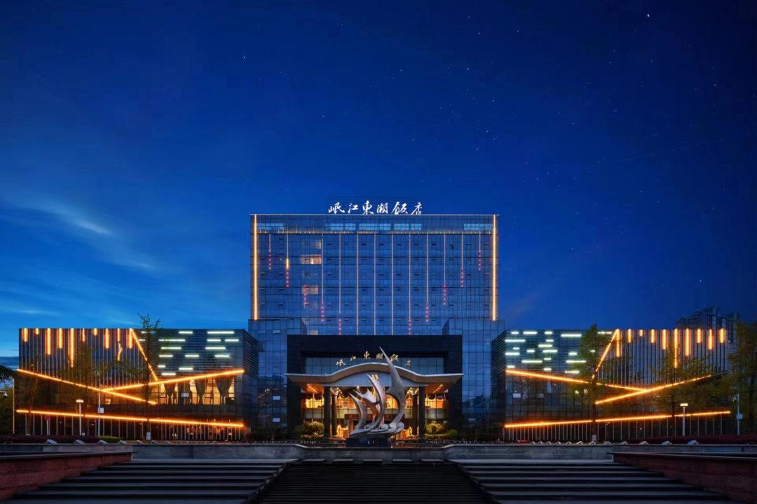 岷江东湖饭店坐落在眉山市主城区东坡岛上,南枕岷江,北邻东坡湖,西接城市湿地公园。饭店园区面积260多亩,有沙滩、湿地、巨型水车、百亩绿地等标志性地物、环境优美。主要建筑有主楼、轩庭、华堂、至乐运动馆和综合辅助楼等5栋,建筑面积4.6万余平方米。