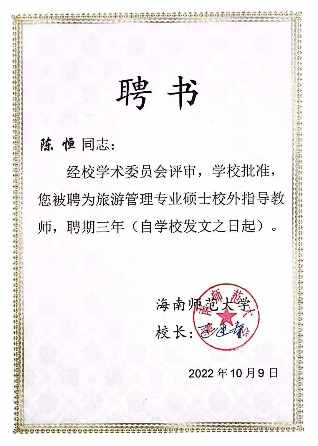 海南省酒店与餐饮行业协会执行会长陈恒收到海南师范大学颁发的“旅游管理专业硕士生校外导师”聘书。