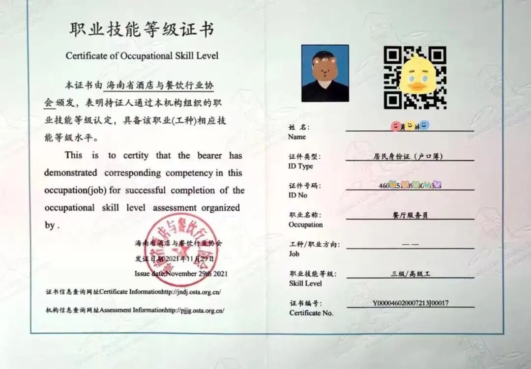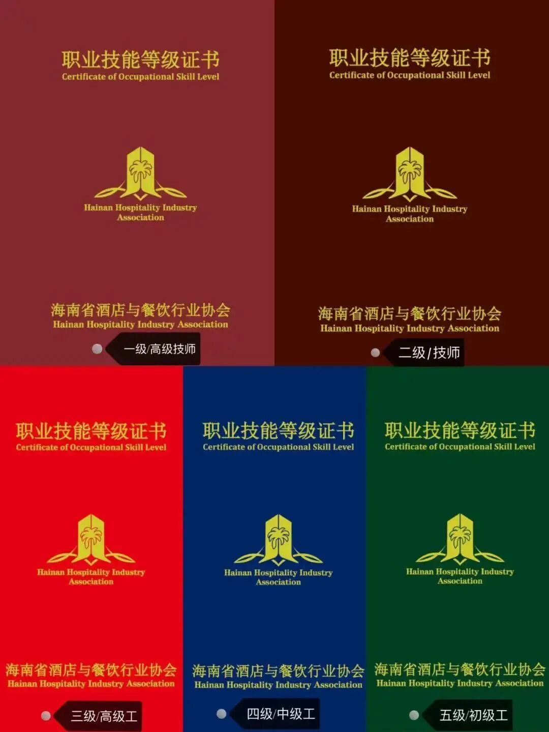 经海南省人力资源开发局批准,省酒店与餐饮行业协会被纳入海南职业技能等级认定试点工作备案管理系统,可在全省酒店与餐饮行业会员企业内开展中式烹调师、中式面点师、西式烹调师、西式面点师、餐厅服务员、客房服务员、前厅服务员职业技能等级认定工作。通过认定并经审核的人员,由省酒餐协颁发相应等级的职业技能等级证书,并由国家备案管理,其证书信息可在人力资源社会保障部职业技能鉴定中心全国联网查询系统查询。