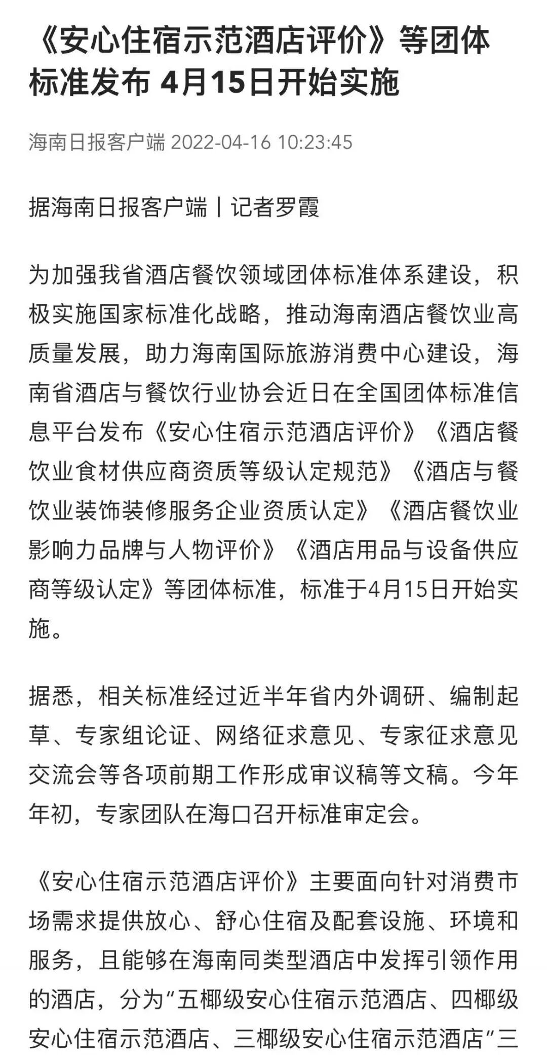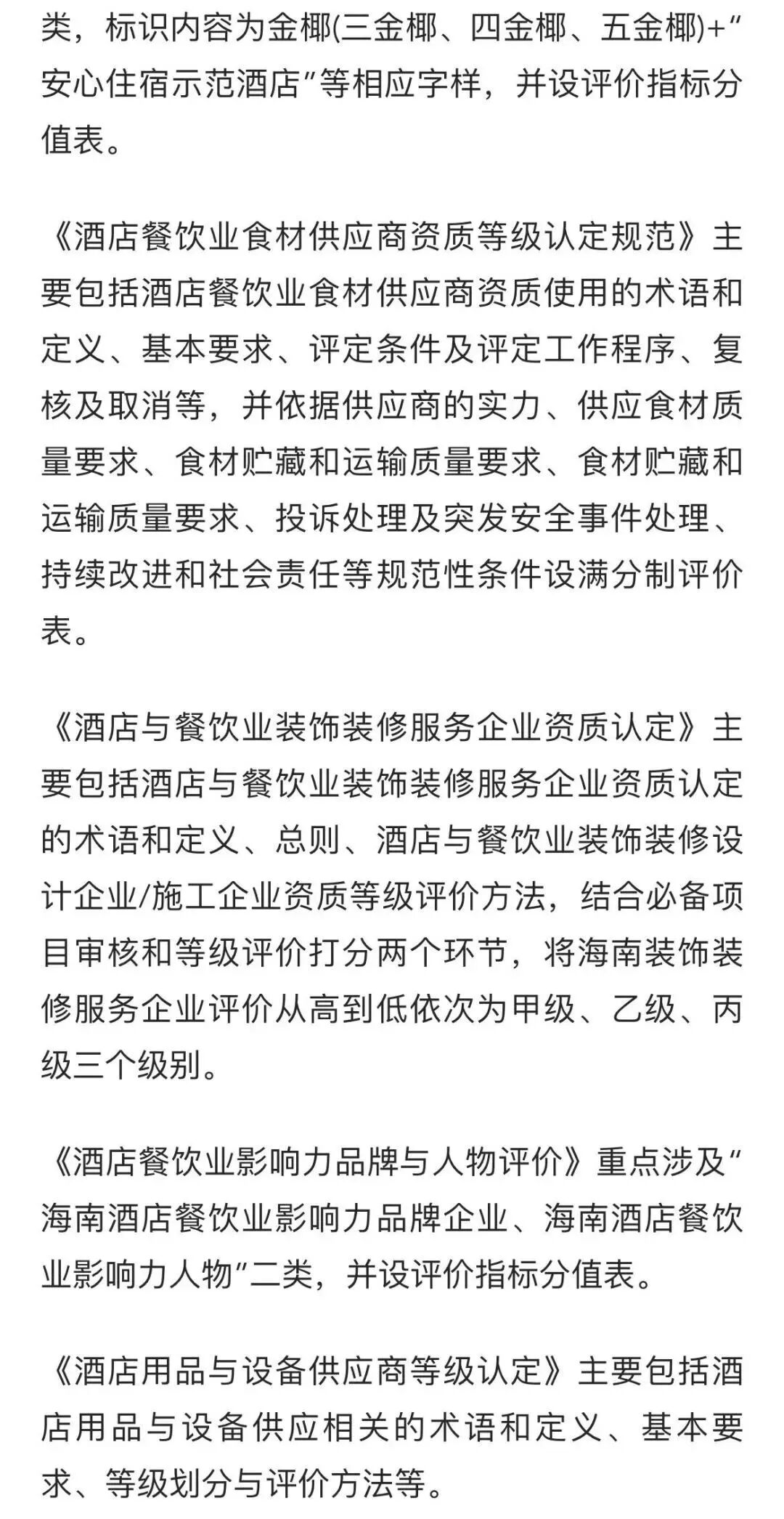 海南省酒店与餐饮行业协会在全国团体标准信息平台发布《安心住宿示范酒店评价》《酒店餐饮业食材供应商资质等级认定规范》《酒店与餐饮业装饰装修服务企业资质认定》《酒店餐饮业影响力品牌与人物评价》《酒店用品与设备供应商等级认定》等团体标准。