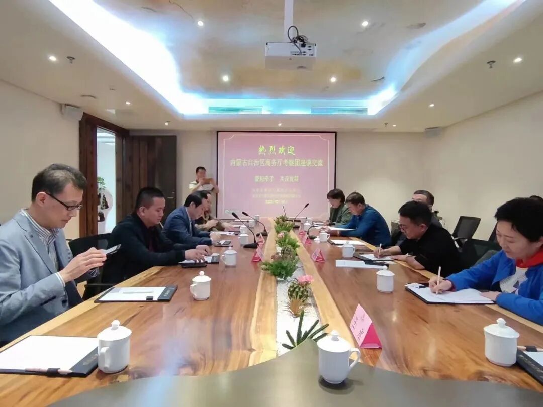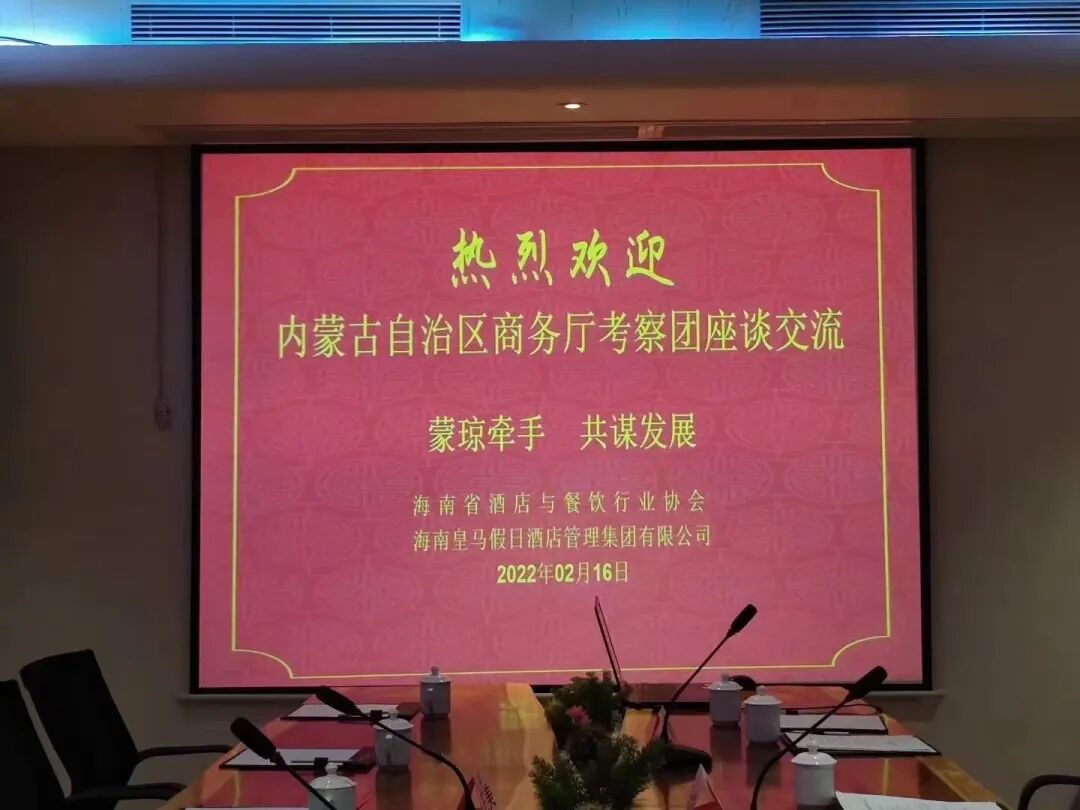 由海南省酒店与餐饮行业协会和协会理事长单位海南皇马假日酒店管理集团有限公司联合举办的内蒙古自治区商务厅考察团座谈交流会在皇马假日游艇度假酒店举行,协会陈恒执行会长、王美主席团主席、陈刚秘书长与内蒙古自治区商务厅尚志強副厅长、内蒙古自治区博览中心董艳春主任、内蒙古老绥元餐饮管理有限公司董事长、内蒙古自治区餐饮与饭店行业协会执行会长李翠萍等一行进行友好交流。