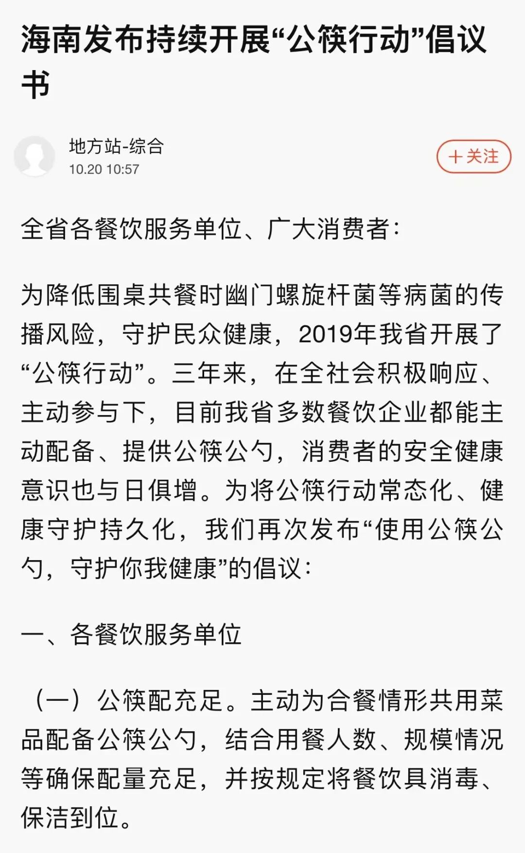海南省市场监督管理局联合海南省酒店与餐饮行业协会等行业组织发布持续开展“公筷行动”倡议。