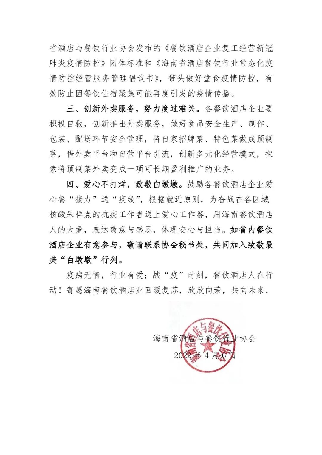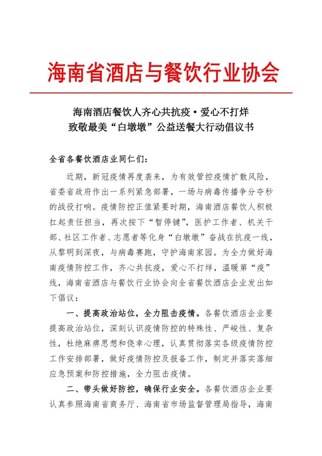 海南省酒店与餐饮行业协会发布《海南酒店餐饮人齐心共抗疫•爱心不打烊,致敬最美“白墩墩”公益送餐大行动》倡议书。
