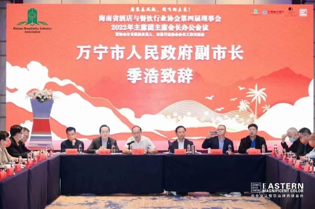 海南省酒店与餐饮行业协会2022年主席团主席会长办公会议暨协会分支机构负责人,市县协会会长工作交流会在万宁市兴隆希尔顿逸林度假酒店召开。万宁市人民政府副市长季浩应邀出席,协会符史钦会长、陈恒执行会长、黄俊忠理事长、李朝清监事长、省酒餐协党支部书记叶桂平、特邀嘉宾协会主席团主席杭州东方网升科技股份有限公司乔毅董事长以及协会各位主席团主席、副会长、副监事长、分支机构及市县协会负责人等160余人参加会议。