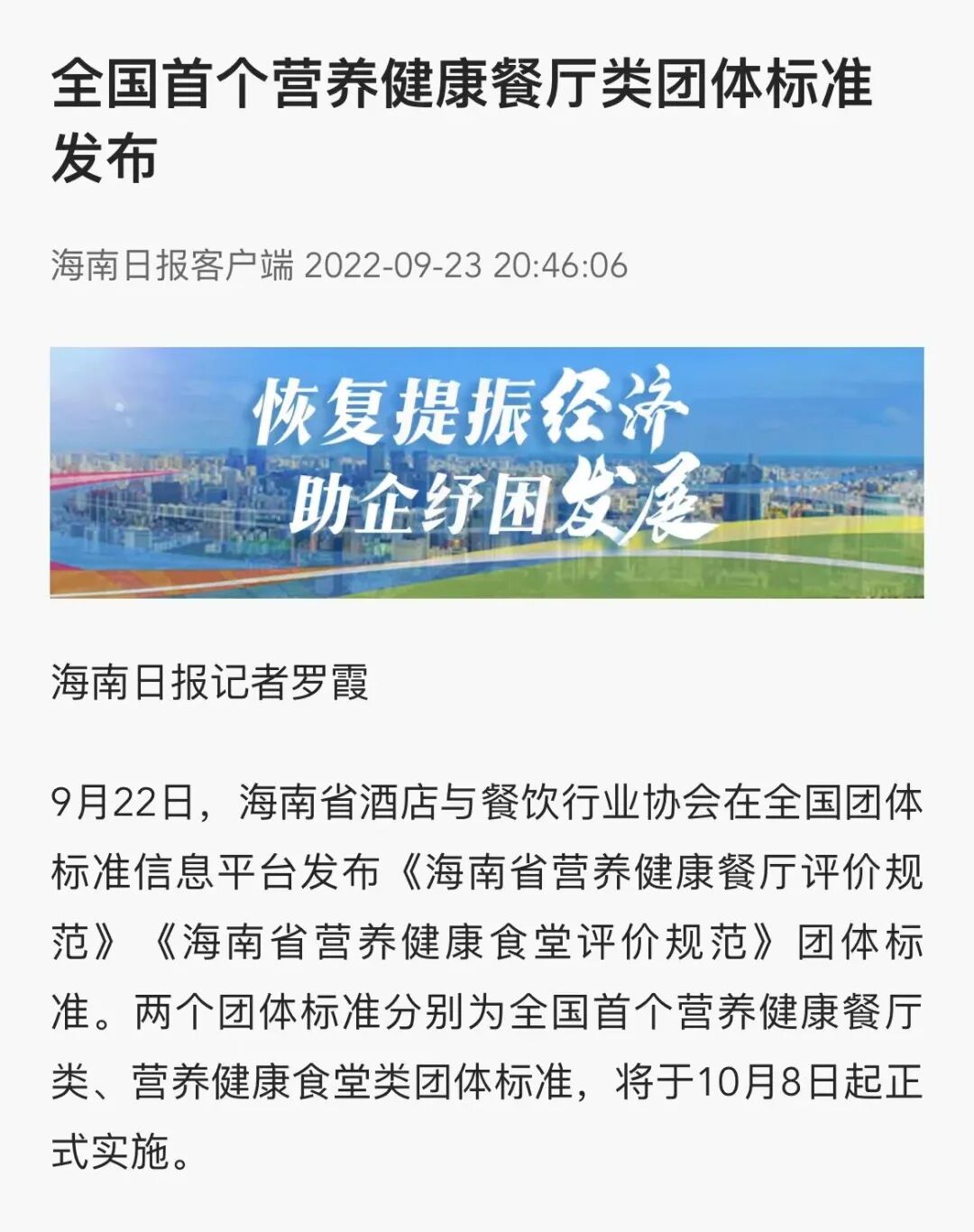 海南省酒店与餐饮行业协会在全国团体标准信息平台发布《海南省营养健康餐厅评价规范》《海南省营养健康食堂评价规范》团体标准。