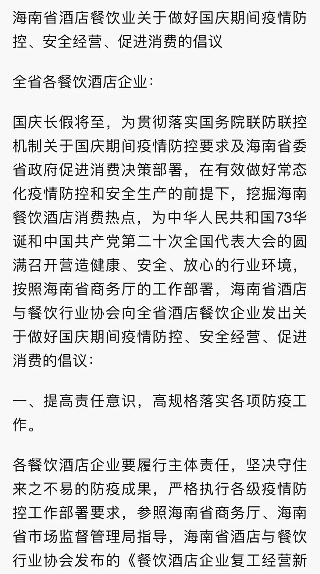 海南省酒店与餐饮行业协会发布关于酒店餐饮业做好国庆期间疫情防控、安全经营、促进消费的倡议。