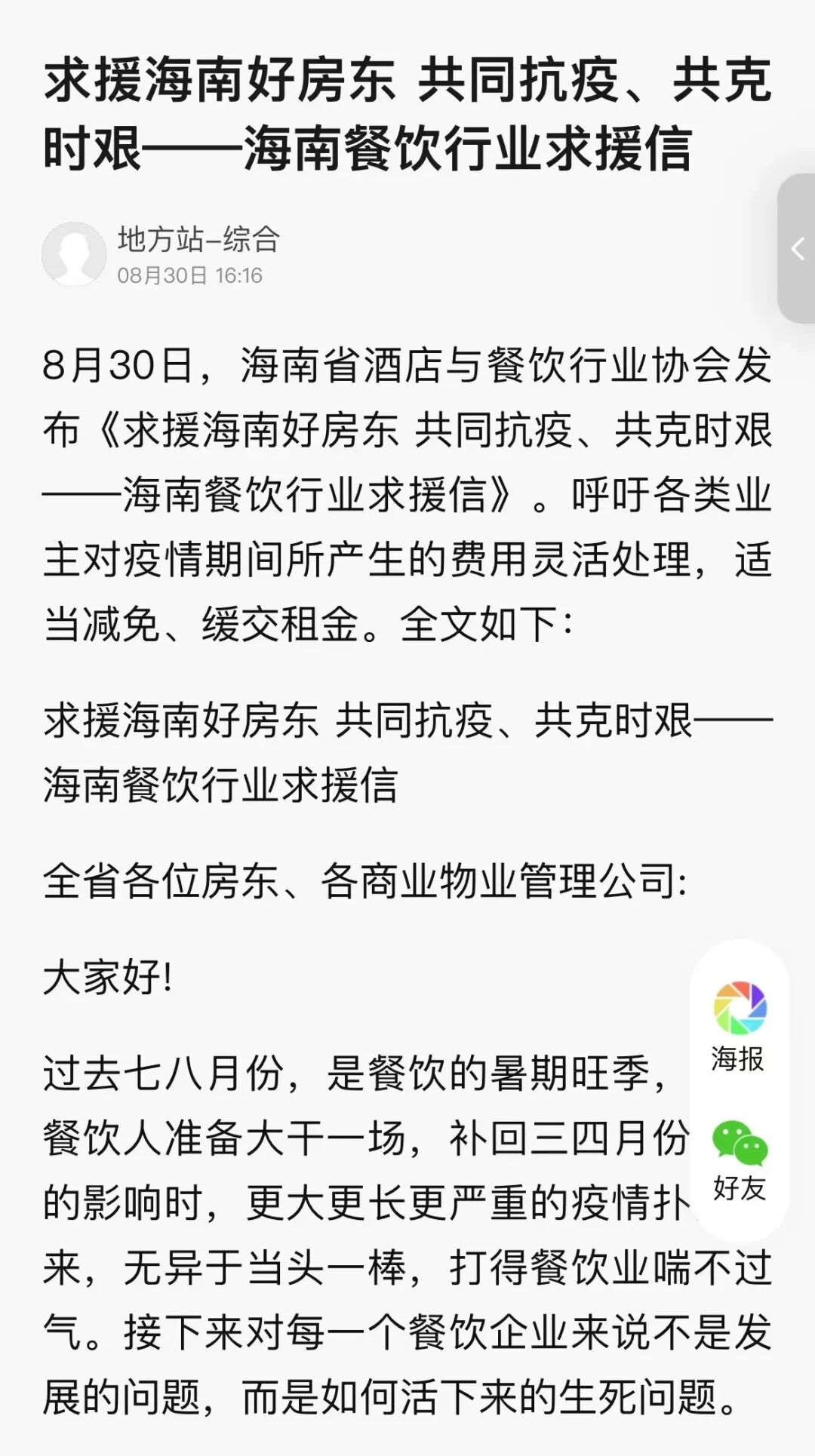 海南省酒店与餐饮行业协会发布《求援海南好房东 共同抗疫、共克时艰——海南餐饮行业求援信》。呼吁各类业主对疫情期间所产生的费用灵活处理,适当减免、缓交租金。
