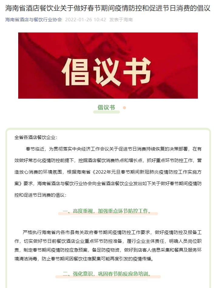 海南省酒店与餐饮行业协会发布关于做好春节期间疫情防控和促进节日消费的倡议。