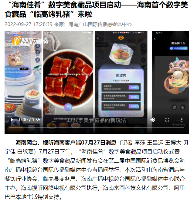 由海南省酒店与餐饮行业协会、临高县商务局、海南广播电视总台国际传播融媒体中心联合主办,海南视听网络电视有限公司执行的“海南佳肴”数字美食藏品项目启动仪式暨“临高烤乳猪”数字美食藏品新闻发布会在第二届中国国际消费品博览会海南广播电视总台国际传播融媒体中心直播间举行,借助数字化手段和区块链技术推出海南首个琼菜美食数字藏品项目。