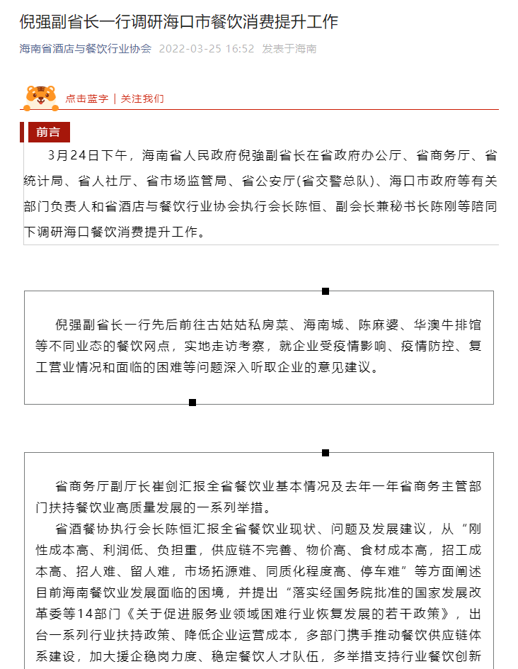 [温馨提示] 文章来源于海南酒店餐饮行业协会公众号,转载注明原文出处,此文观点与查生意无关,理性阅读,版权属于原作者若无意侵犯媒体或个人知识产权,请联系我们,本站将在第一时间删掉 ,查生意仅提供信息存储空间服务。