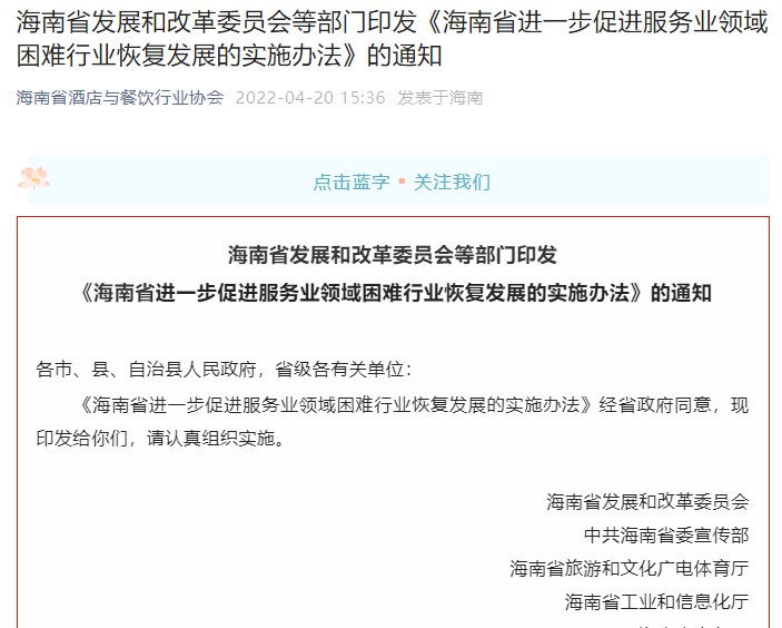 海南省酒店与餐饮行业协会转发海南省发展和改革委员会等部门印发的《海南省进一步促进服务业领域困难行业恢复发展的实施办法》通知,助力行业企业疫后复苏。