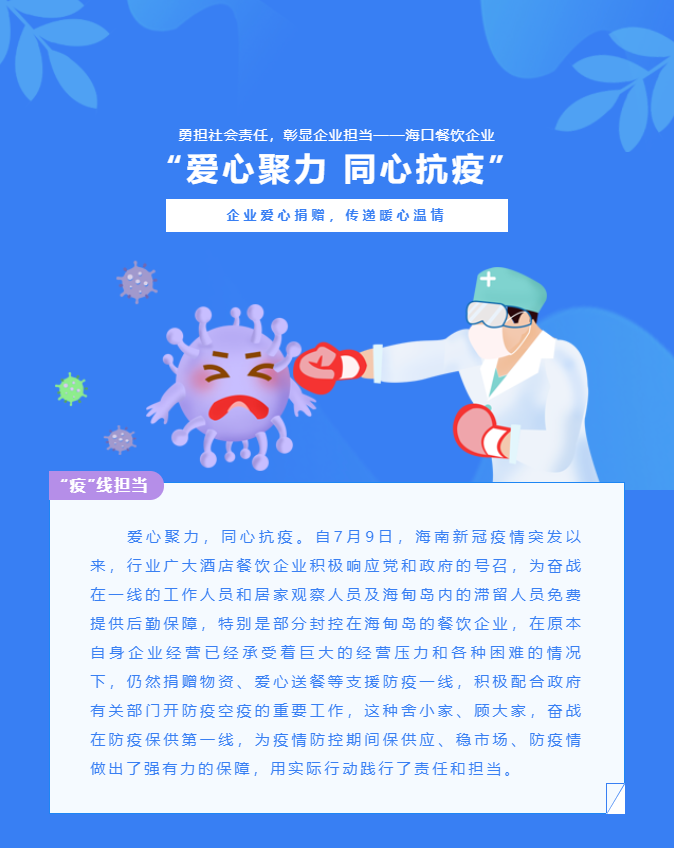 海南省酒店与餐饮行业协会开展“ 凝聚战役正能量,疫情防控我担当”的爱心公益活动,组织省内80多家餐饮酒店及供应商企业为抗疫工作者送爱心餐、捐赠防疫物资、驰援方舱建设。