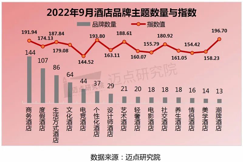 据迈点研究院数据显示,2022年9月酒店主题数量分布中,商务酒店占比最多,多达140个;潮牌酒店占比最少,为13个。品牌指数均值来看,潮牌酒店、个性化酒店和商务酒店位列前三;电竞酒店品牌指数均值最低,为144.52,品牌影响力仍在培育期。从品牌指数的的环比变化来看,电竞酒店下降幅度最大,为-23.76 %;潮牌酒店上升幅度最大,为28.21%。