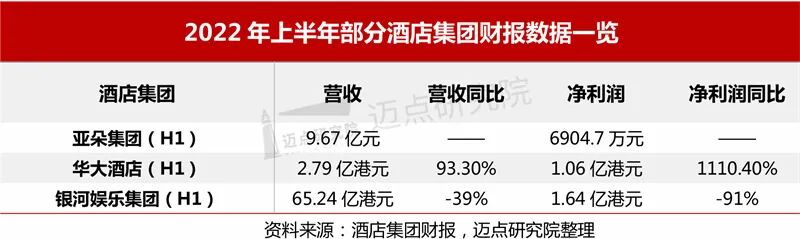 9月,各酒店集团相继公布2022年上半年财报,亚朵集团营收9.67亿元,归母净利润为6904.7万元,门店数量净增加89家;华大酒店营收2.79亿港元,溢利1.06亿港元,较2021年同期增加9700万港元;银河娱乐集团营收65.24亿港元,按年下跌39%。