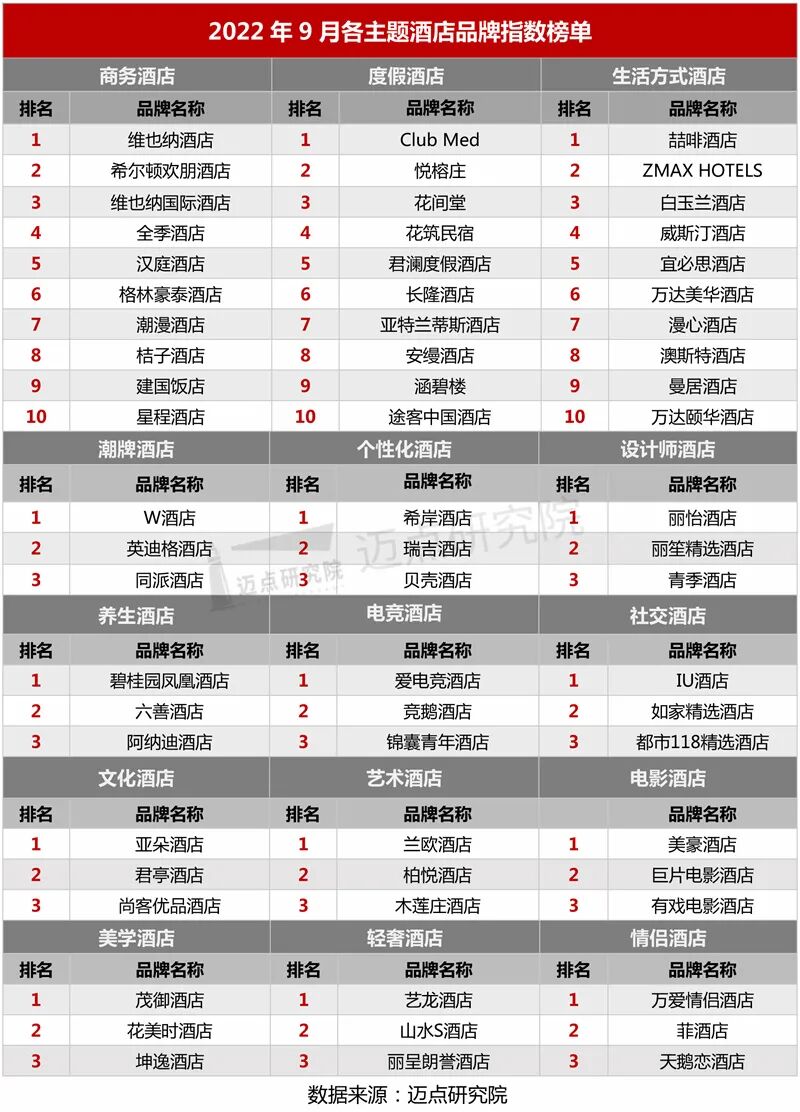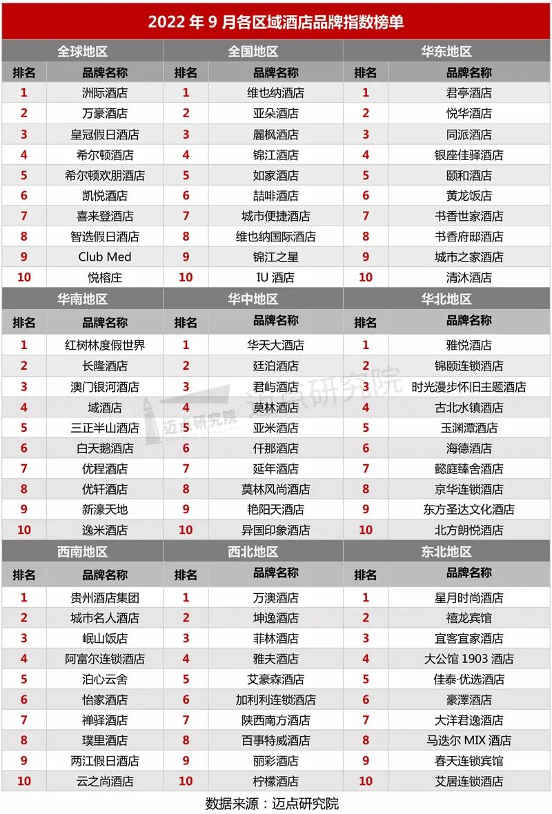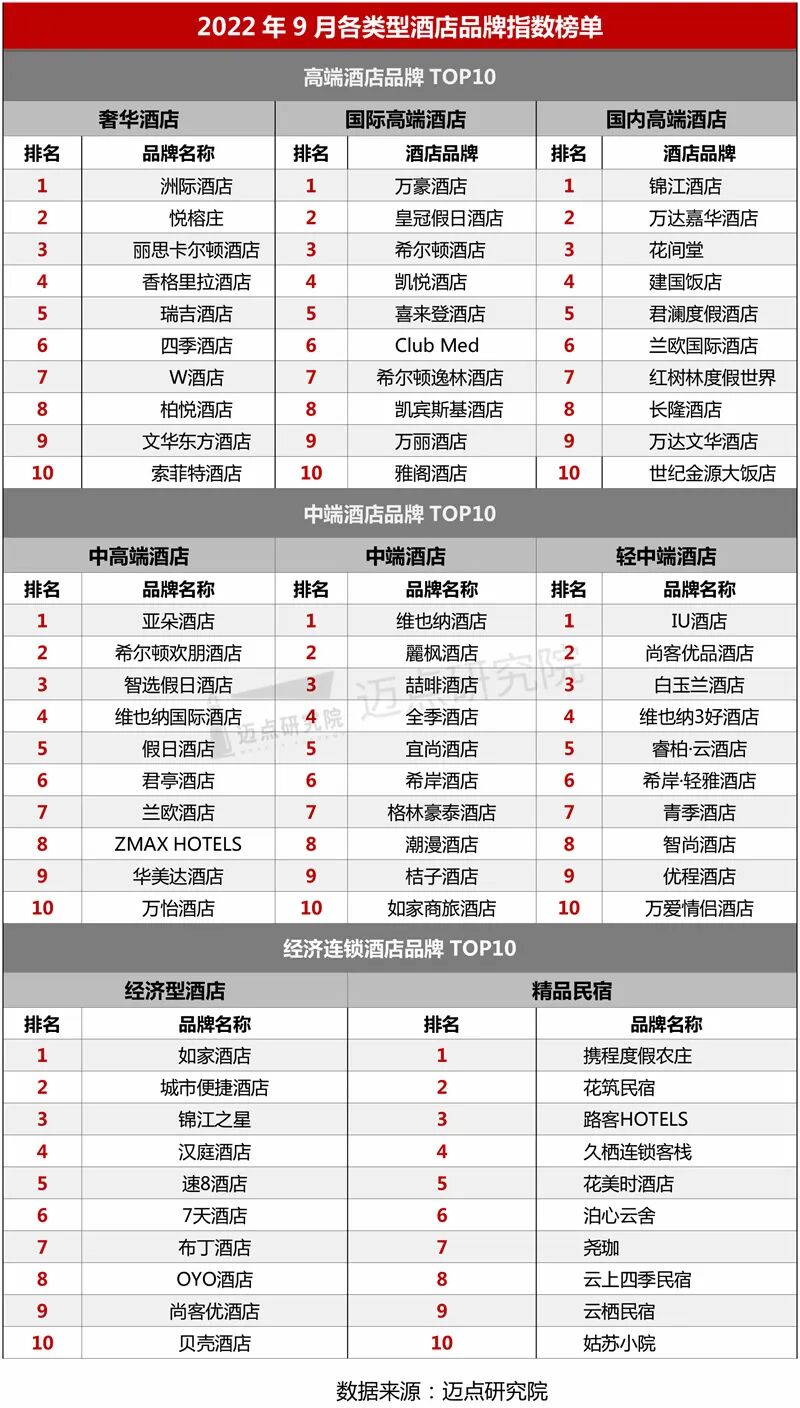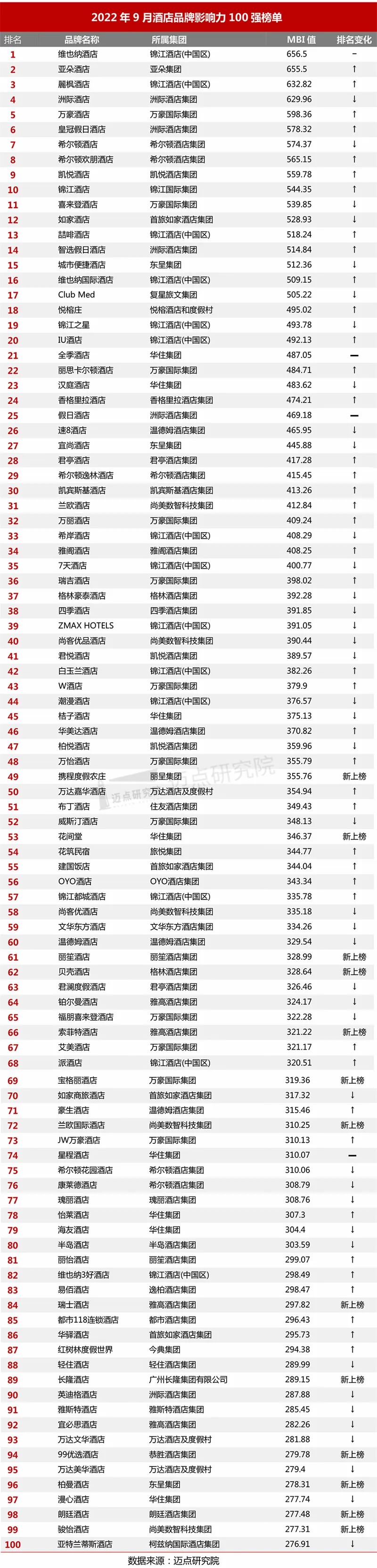 “2022年9月酒店品牌影响力(MBI)100强榜单”数据来源于迈点品牌指数MBI,根据9月迈点MBI八大旅游住宿业品牌类目中的1789个品牌数据汇总统计而成。具体说明如下:
