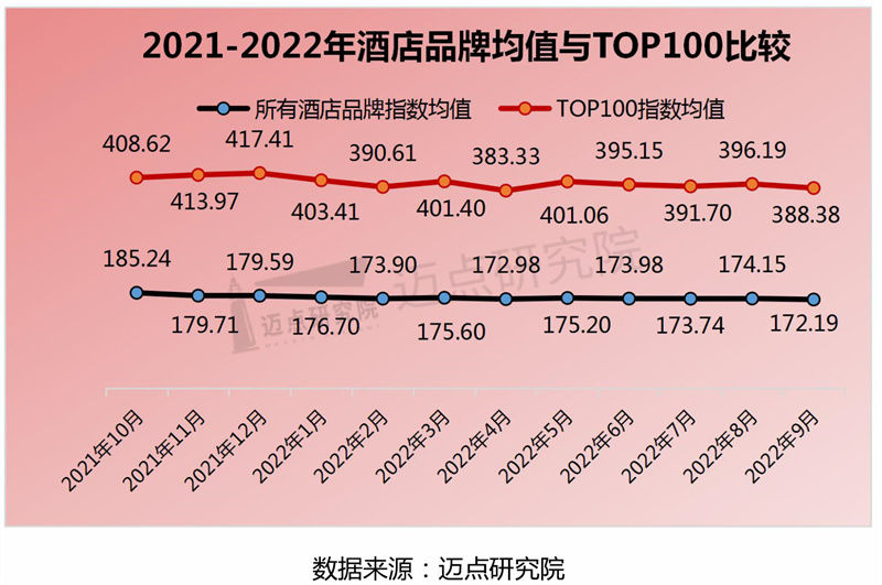 9月百强榜单和整体酒店品牌指数均呈现小幅下降态势,2022年9月TOP100品牌值均数为388.38,环比下降2.01%;整体酒店品牌指数均值172.19,环比下降1.14%。但整体品牌指数均值与TOP100仍呈现较大差距,反映出头部品牌在市场认可度和品牌投资方面的价值红利。