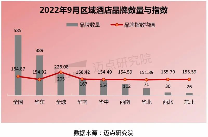 2022年9月区域酒店分布中,全国性品牌数量最多,有585个;其次是华东区域品牌,有389个;再次为全球性品牌,有205个。从各区域酒店品牌指数来看,全球性和全国性品牌以绝对性的优势领先,其次分别为华南、西北、东北、华东、西南、华中以及华北地区。各区域品牌指数平均值为173.54,仅有全球性和全国性品牌高于平均值,其他区域品牌均低于平均值。从品牌指数的环比变化来看,西北区域酒店品牌下降幅度最大,为-0.45%;西南区域酒店品牌上升幅度最大,为0.18%。