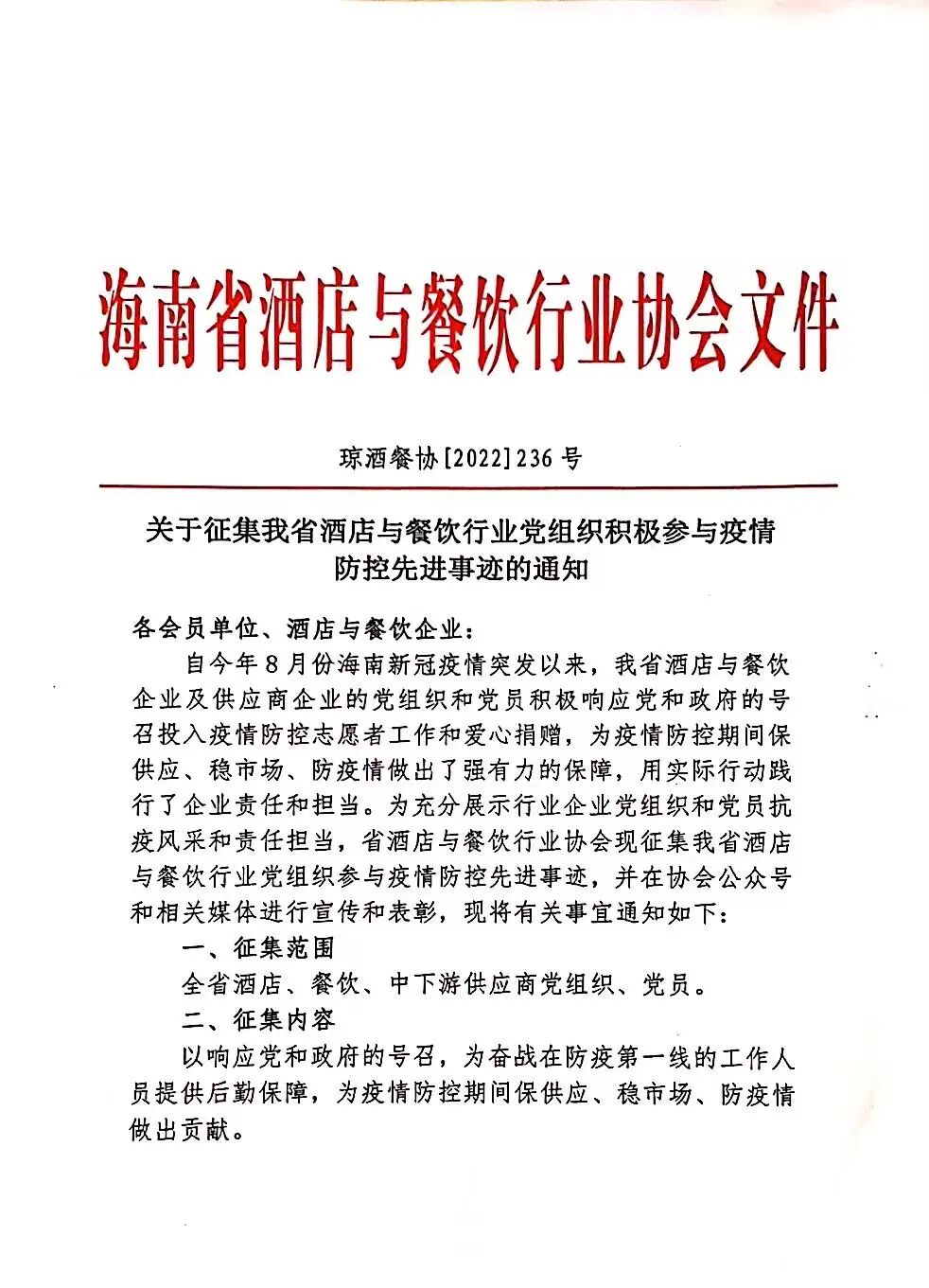 关于征集我省酒店与餐饮行业党组织积极参与疫情防控先进事迹的通知