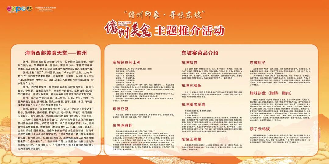 消博会前夕,海南省酒店与餐饮行业协会联合儋州市美食行业协会,依据海南《地标美食名店、名宴、名菜、名小吃、食材评价规范》团体标准,根据东坡文化典故,组织名厨大师深入挖掘东坡文化内涵,结合儋州特色食材资源,经过多层选拔评审,认定1席儋州名宴、20道地标名菜、10道地标名小吃、15种地标名食材,并于活动现场展示推介。