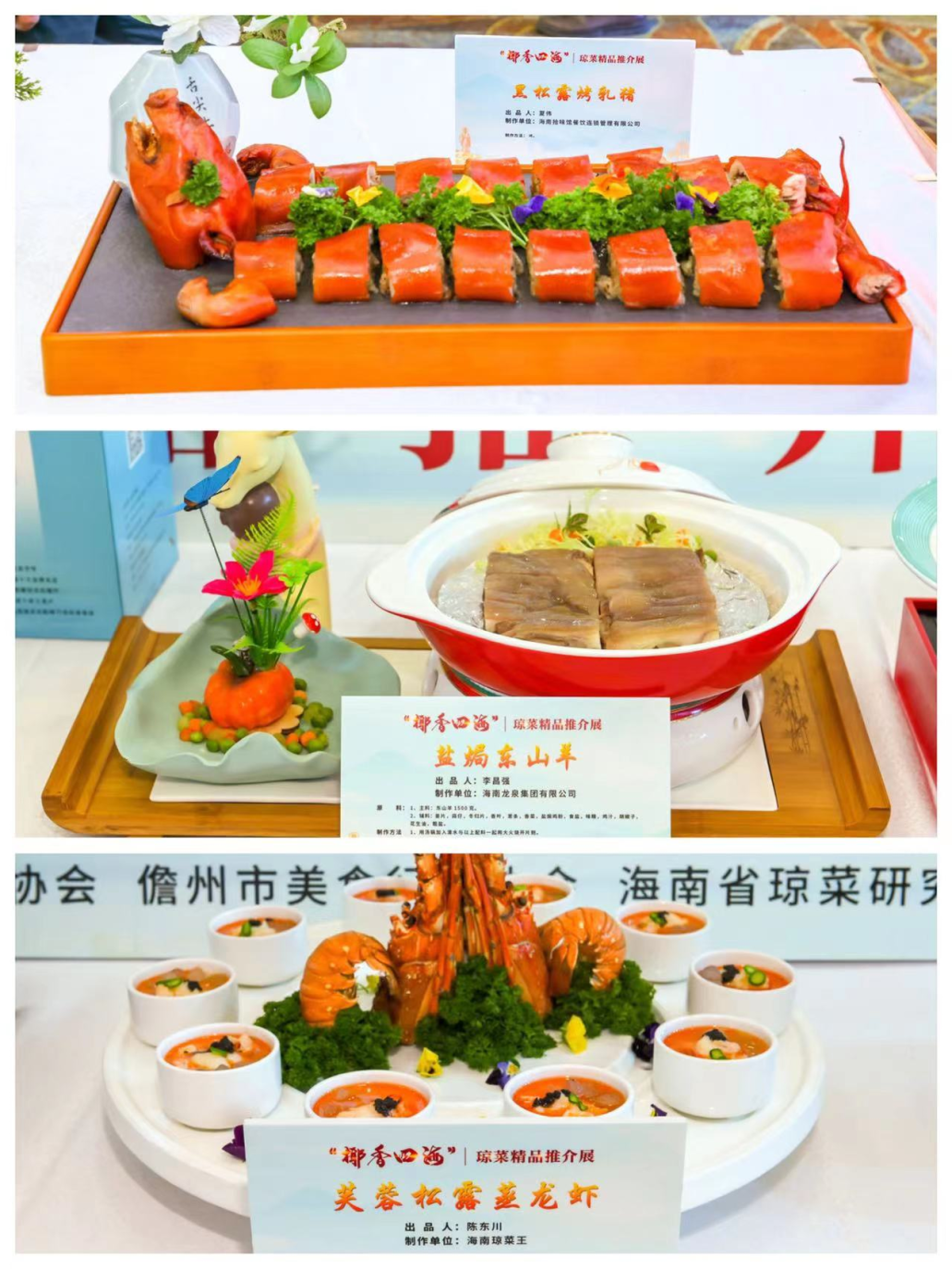 现场重磅推出由李学深大师团队出品的“印象牡丹大花龙、金牌四更烤乳猪、菠萝海鲜全家福、创意东星斑等”琼菜印象宴,陈大贵大师团队出品的“海南三宝东山乳羊、椰城脆皮香茅鸽、金汤海南洋港鱼肚等”海南琼菜盛宴和儋州美食行业协会出品的“东坡肘子、东坡扣肉、东坡五柳鱼等”东坡宴三席琼菜名宴,展现琼菜饮食文化软实力。活动特设“椰香四海”琼菜精品推介展,向参加消博会的中外媒体代表、全国部分省市参会嘉宾等发布琼菜精品,由龙泉集团、欢乐海岸美食联盟、拾味馆、琼菜王、海口华诚汇-琼菜印象、古姑姑、海南迎宾等省内名企团队出品推介“黑松露烤乳猪、芙蓉松露蒸龙虾、盐焗东山羊”等66道琼菜精品;另设主宾市儋州东坡美食推介专区,发布展示1席儋州名宴、20道地标名菜、10道地标名小吃、15种地标名食材。