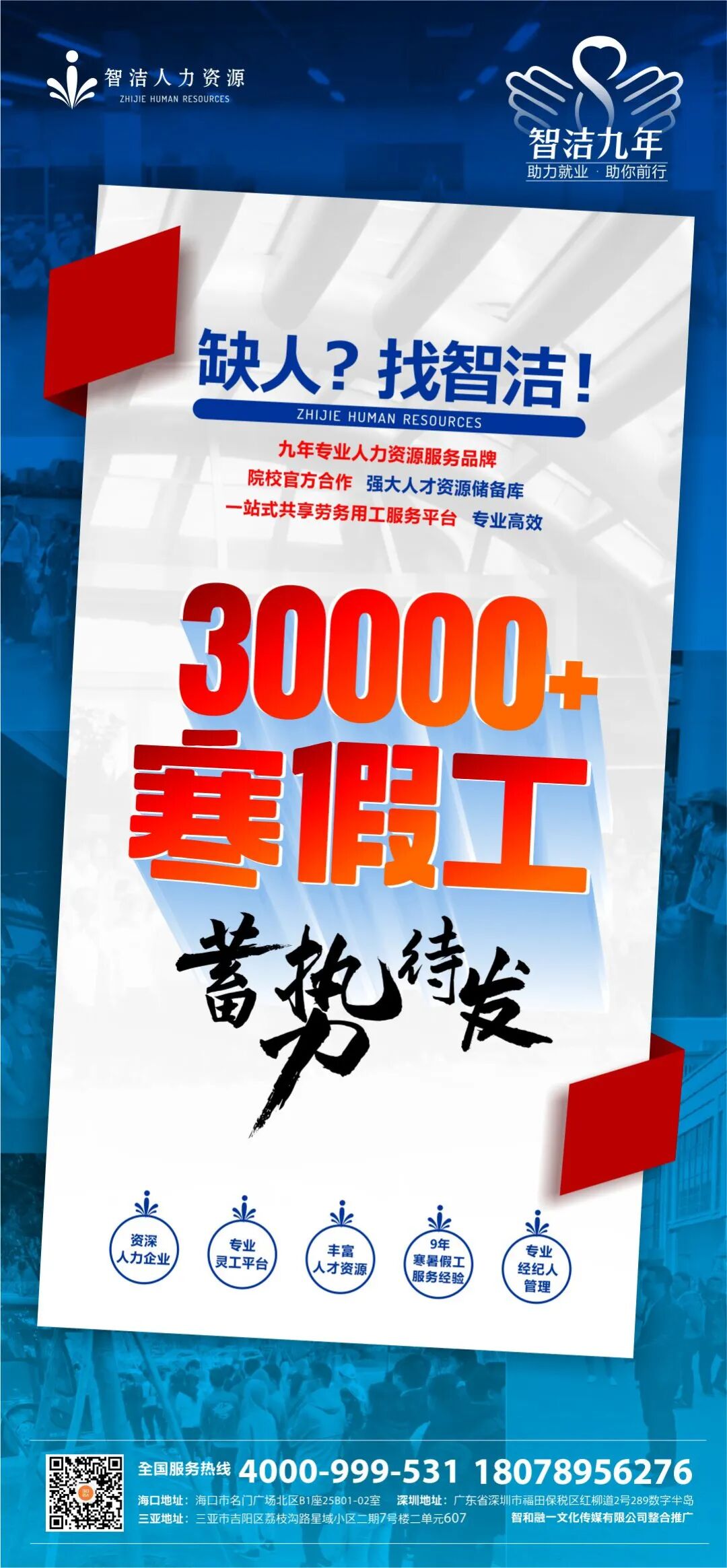 目前,旅游旺季开启,春节、寒假即将来袭,正值企业用人高峰期;需要大量人力支持来解决企业用工紧缺的难题。智洁人力有着9年寒暑假工服务经验,人才储备30000+,快速响应满足企业用人需求。同时还有专业团队管理,减少用工管理压力,提高工作效率;助力海南自贸港招才引智建设,满足华南区劳务用工单位人力资源需求;为企业提供专业、高效、便利的人力资源服务与支持。