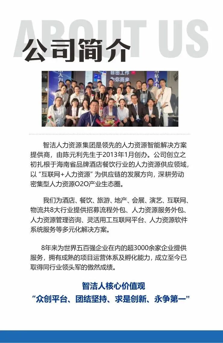 作为海南资深人力资源企业、酒店人力资源整合机构第一品牌;智洁人力不仅有一站式劳务用工服务平台、五星级人力外包服务品牌,在今年更是与海南银行、支付宝知名企业达成合作;以多样化人力资源服务,助力企业升级灵活用工。
