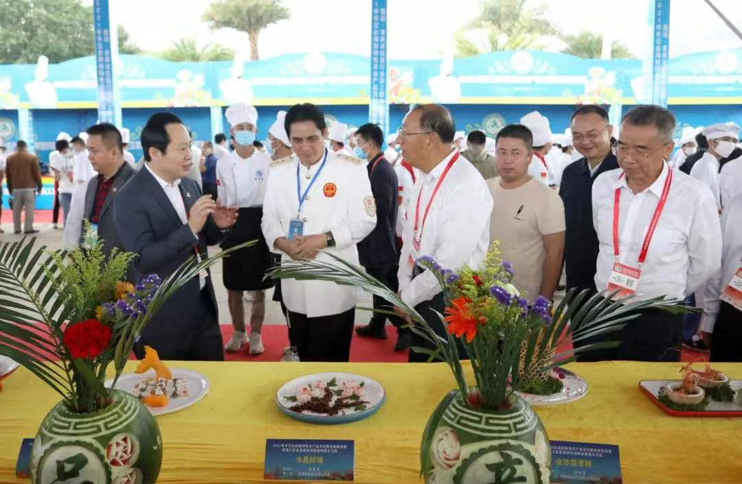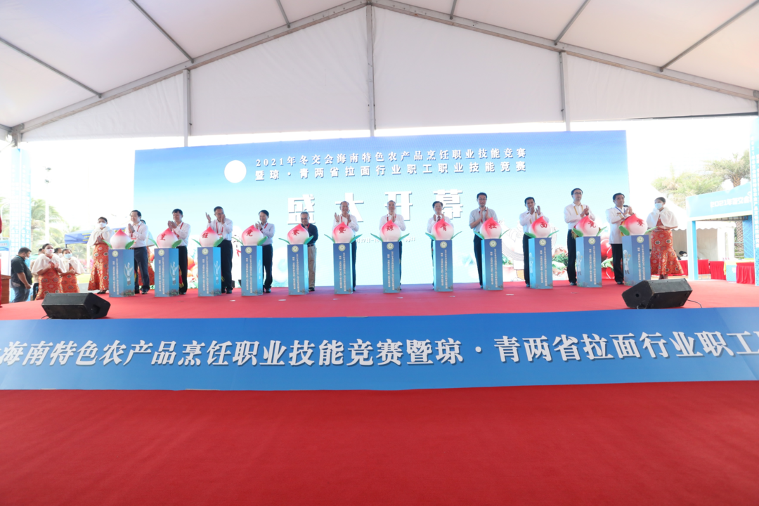 12月17日上午,由海南省总工会、青海省总工会、海南省人力资源和社会保障厅主办,海南省财贸旅游烟草工会、海南省职工服务中心、青海省化隆县地方品牌产业培育促进局、海南省酒店与餐饮行业协会、海南省酒店与餐饮行业工会联合会承办的“2021年冬交会海南特色农产品烹饪职业技能竞赛暨琼青两省拉面行业职工职业技能大赛”在海南国际会展中心隆重开幕。全总副主席、中共青海省委常委、青海省总工会主席马吉孝,海南省人大常委会副主任、海南省总工会主席陆志远,海南省总工会党组书记、常务副主席王全,青海省总工会党组书记、常务副主席陈志忠,海南省人力资源和社会保障厅党组成员、副厅长林琳,海南省农业农村厅总畜牧师郑轶,海南省总工会党组成员、副主席何清,海南省总工会党组成员、副主席王裕明,青海省总工会党组成员、副主席吴建军,海南省酒店与餐饮行业协会执行会长陈恒,青海省餐饮行业协会会长马占龙以及各市县总工会和餐饮烹饪协会相关负责人,省内酒店餐饮企业负责人、参展企业、参赛选手、媒体代表500多人参加。