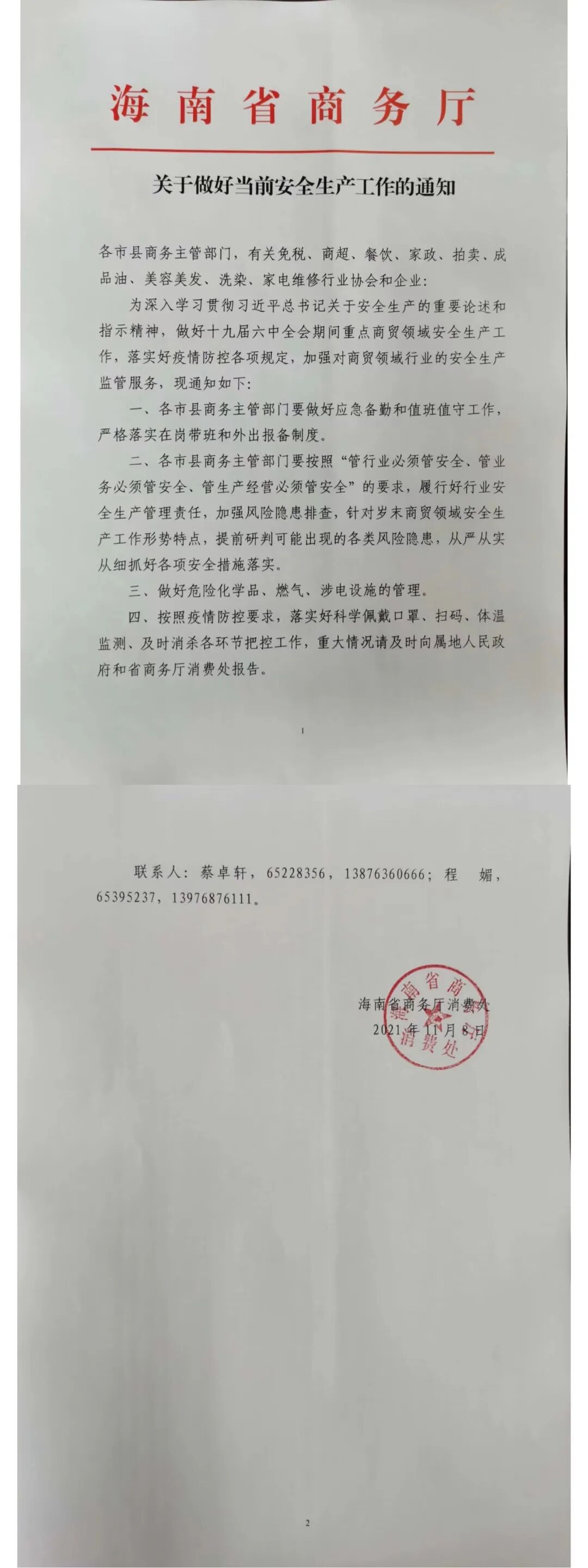 为深入学习贯彻习近平总书记关于安全生产的重要论述和指示精神,做好十九届六中全会期间重点商贸领域安全生产工作,落实好疫情防控各项规定,加强对商贸领域行业的安全生产监管服务,现通知如下∶