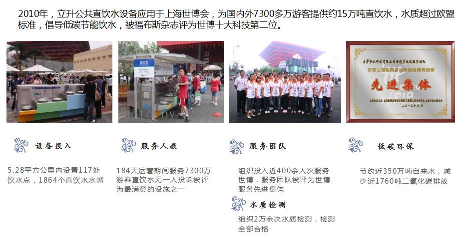 立升在大型直饮水项目上积累了丰富的经验,世博直饮水是目前世界上具有相当规模的大型公共直饮水项目之一,直接将自来水过滤成高标准的直饮水,对技术安全性、可靠性和服务保障能力要求很高。