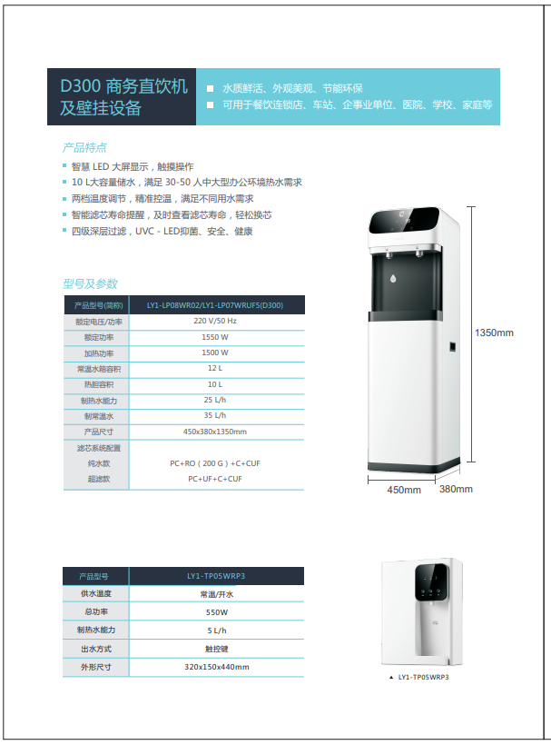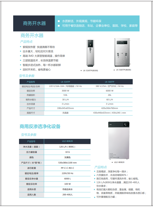 立升商务净水在政府机关单位、企事业单位、学校、医院、公园广场及餐饮酒店等领域被广泛应用。2010年,立升企业承担了上海世博会世博园区全部直饮水设施的建造和维护工作,为来自全球超过7300万名游客提供高标准的直饮水,立升直饮水技术被美国《福布斯》杂志评为本届世博会展示的“引领未来十大科技第二位”。2012年,立升直饮水技术又被重庆园博园采用,并在海南国际旅游岛各主要旅游到达地的54个景区、12个市县旅游咨询中心和博鳌酒店等窗口单位得到推广应用,成为世界范围内规划完整、规模庞大、整体覆盖区域广泛的大型公共直饮水工程范例。