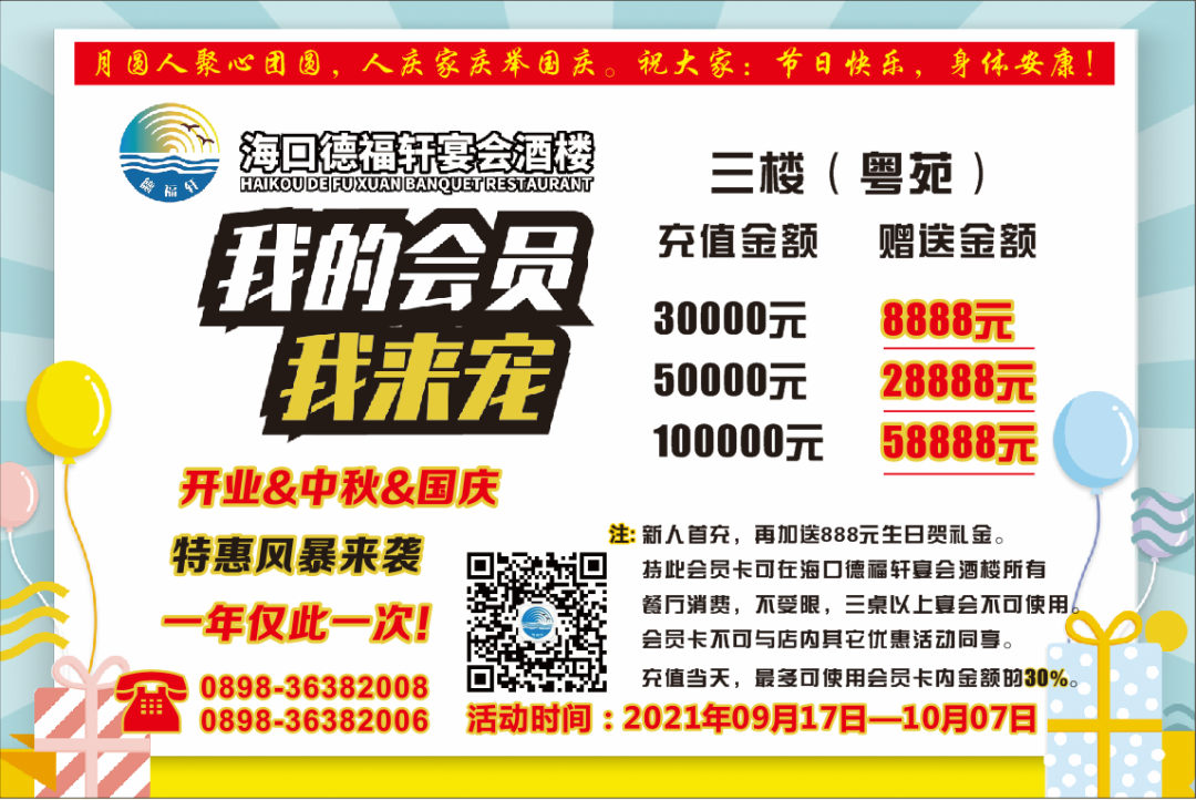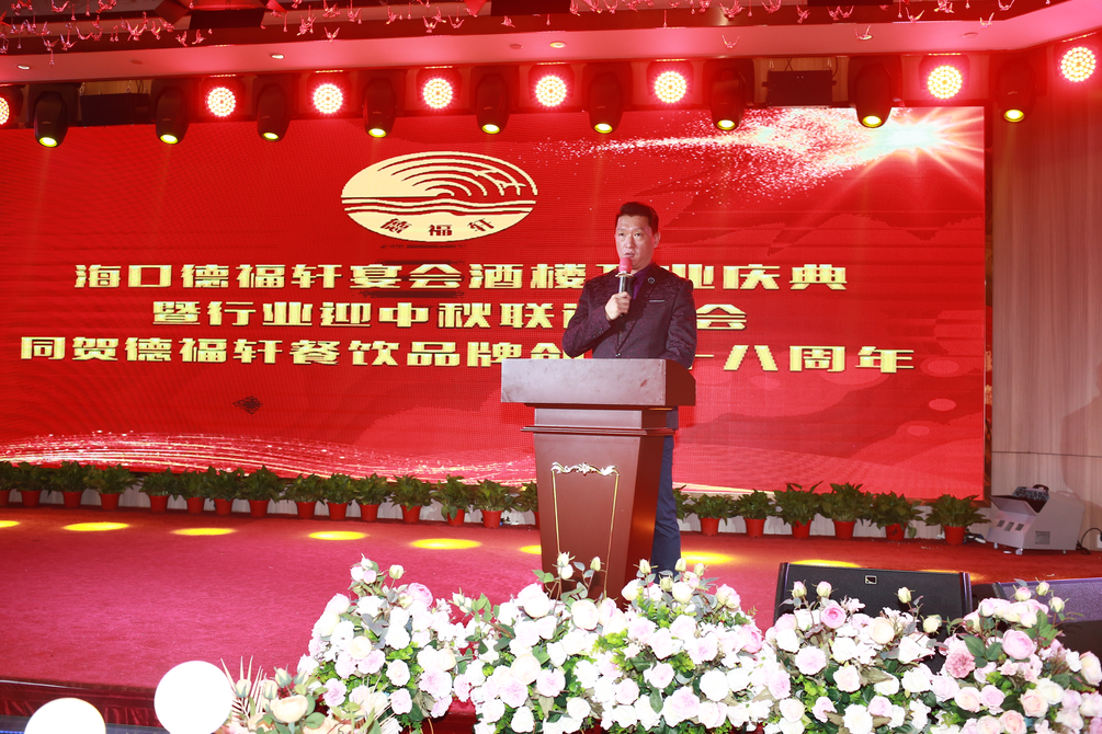 时至中秋国庆佳节来临之际,2021年9月17日,海口德福轩宴会酒楼开业庆典暨行业迎中秋联谊晚会——德福轩品牌创建十八周年庆祝宴会圆满举行。