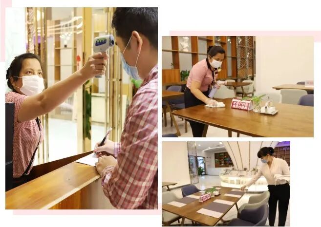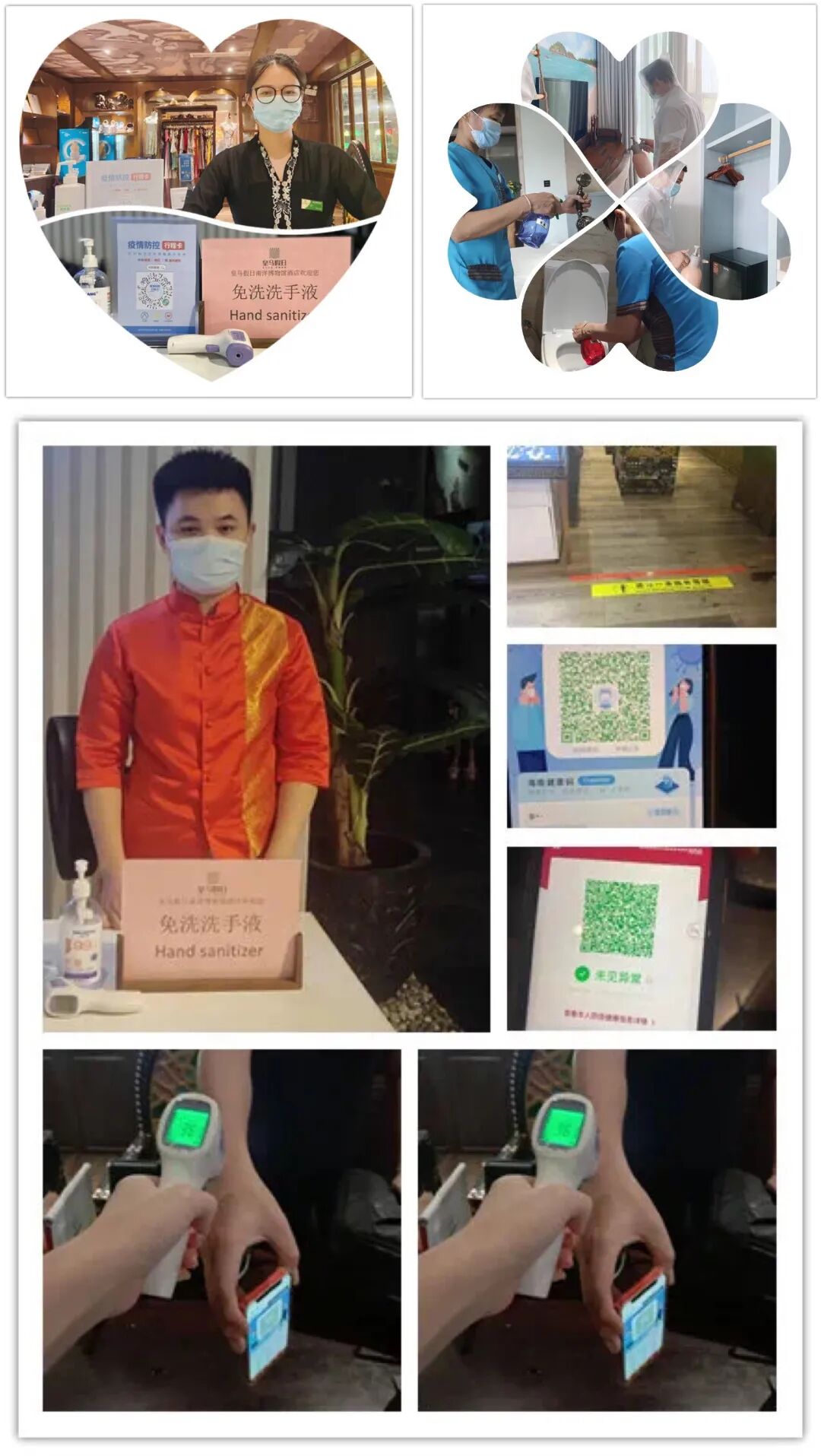 酒店对于所有入住客人,第一时间登记体温进行行程码+健康绿码查验,在大堂入口、餐饮用餐区均设体温检测环节,每日进行员工和客人体温检测并登记准确数据。