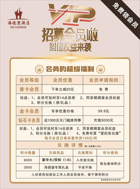 四、酒店中餐厅消费不打折,消费满1288元/席赠送标准双床1间(房券);满1688元/席赠送豪华大床房1间(房券),房券有效期2个月