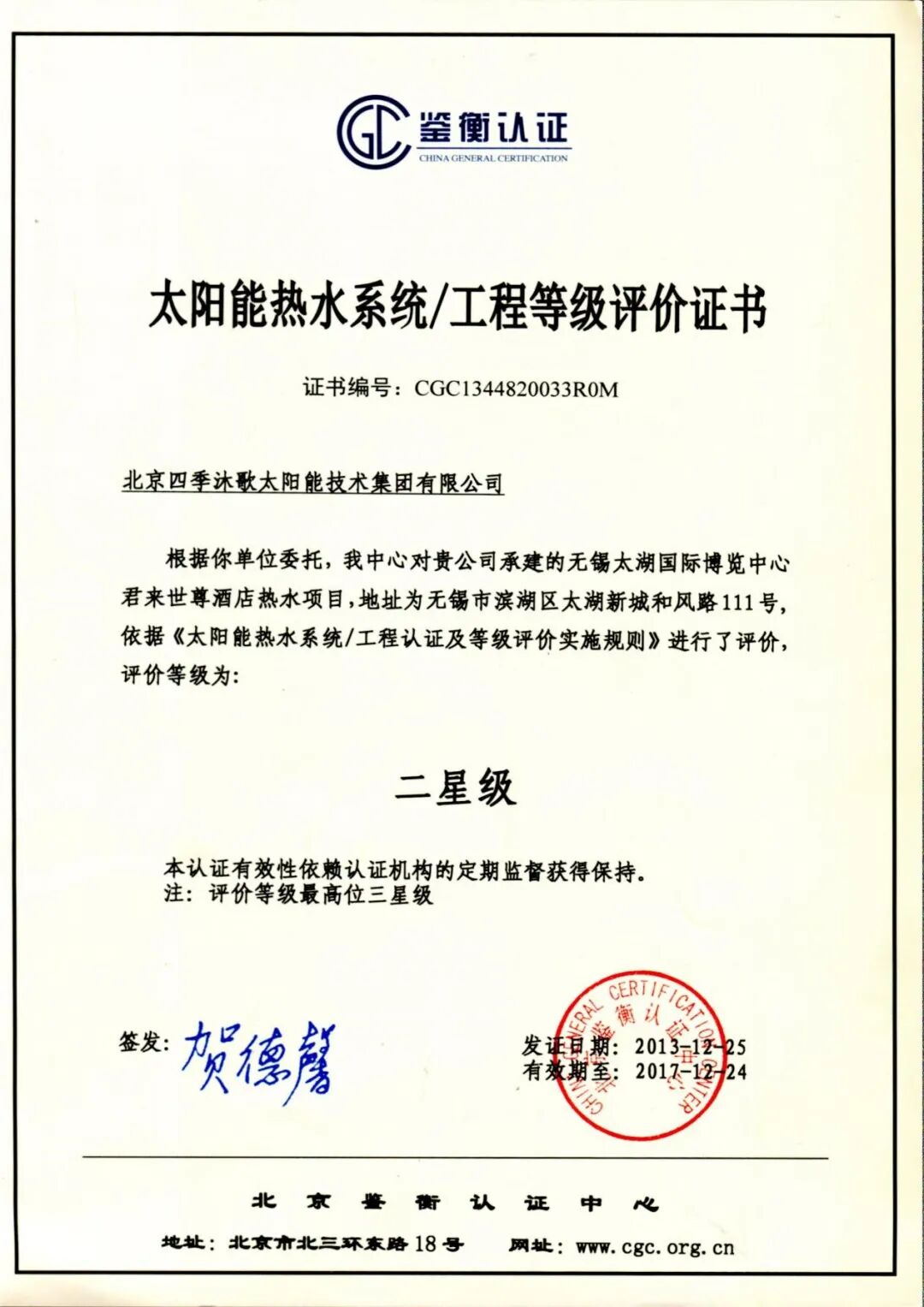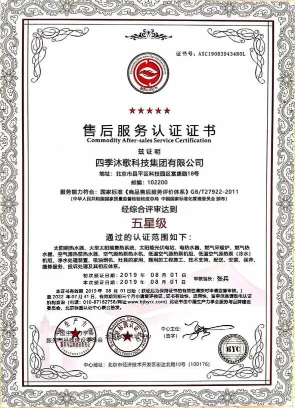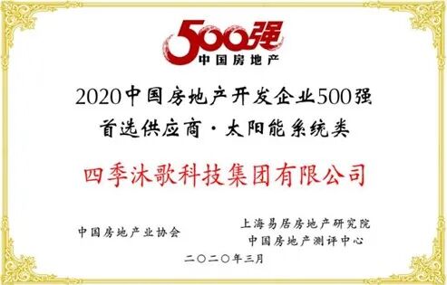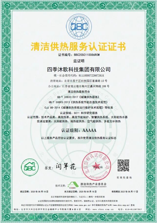 目前四季沐歌已经拥有国家发改委、科技部、财政部、海关总署以及国家税务总局联合认定的“企业技术中心”、设有国家级“博士科研工作站”, 拥有CNAS国家认可实验室以及中国唯一的太阳能模拟系统实验室,是首批“清洁供热服务认证”5A级证书,连续八年成为中国房地产500强首选供应商,入选全球新能源500强榜单,在全球160多个国家,共计完成了10000多个清洁能源项目,沉淀了1600多万用户数据,汇聚了20000家客户服务网店。