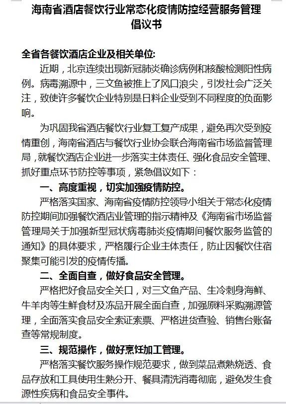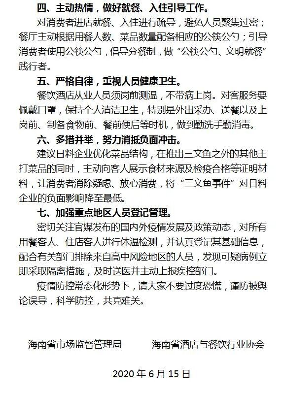 2、全面执行各项疫情防控措施,提升责任意识,参照海南省市场监督管理局《海南省酒店餐饮行业常态化疫情防控经营服务管理倡议书》、海南省酒店与餐饮行业协会《餐饮酒店企业复工经营新冠肺炎疫情防控》团体标准,充分发挥餐饮服务经营单位社会担当,与疫情战斗到底,切实抓好疫情防控各项工作。