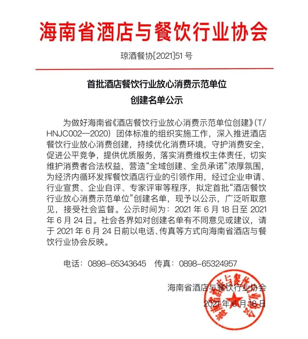 首批酒店餐饮行业放心消费示范单位创建名单公示