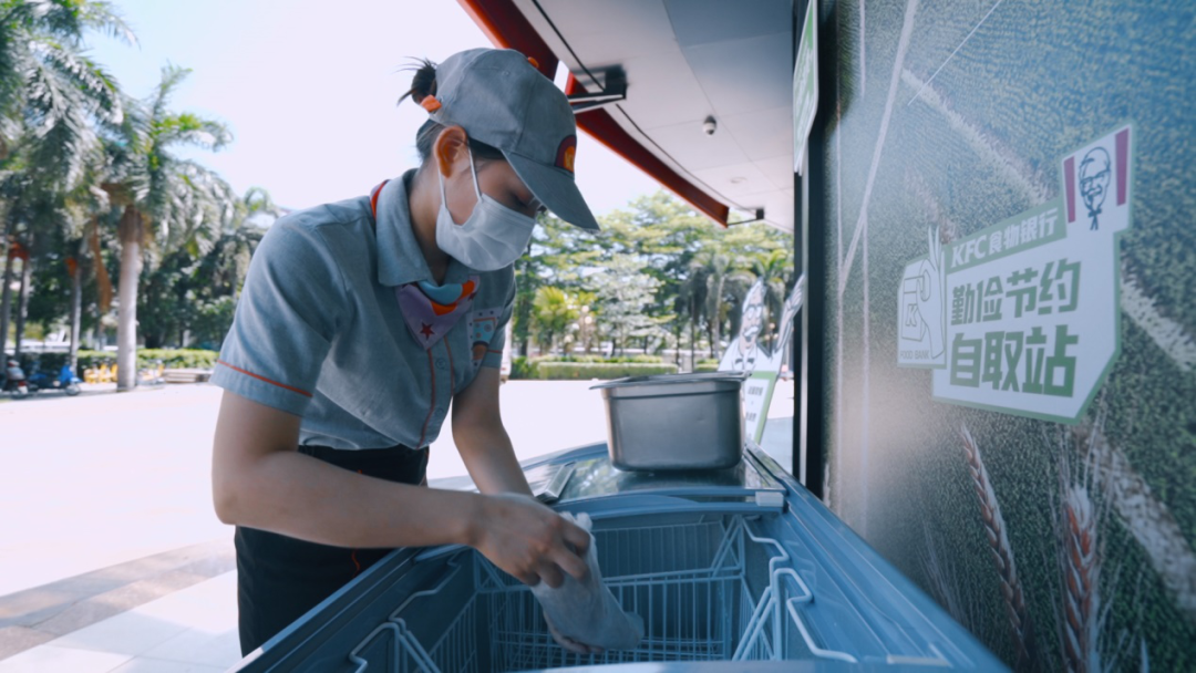 图:餐厅工作人员向“肯德基食物银行”的冰柜里放置食物
