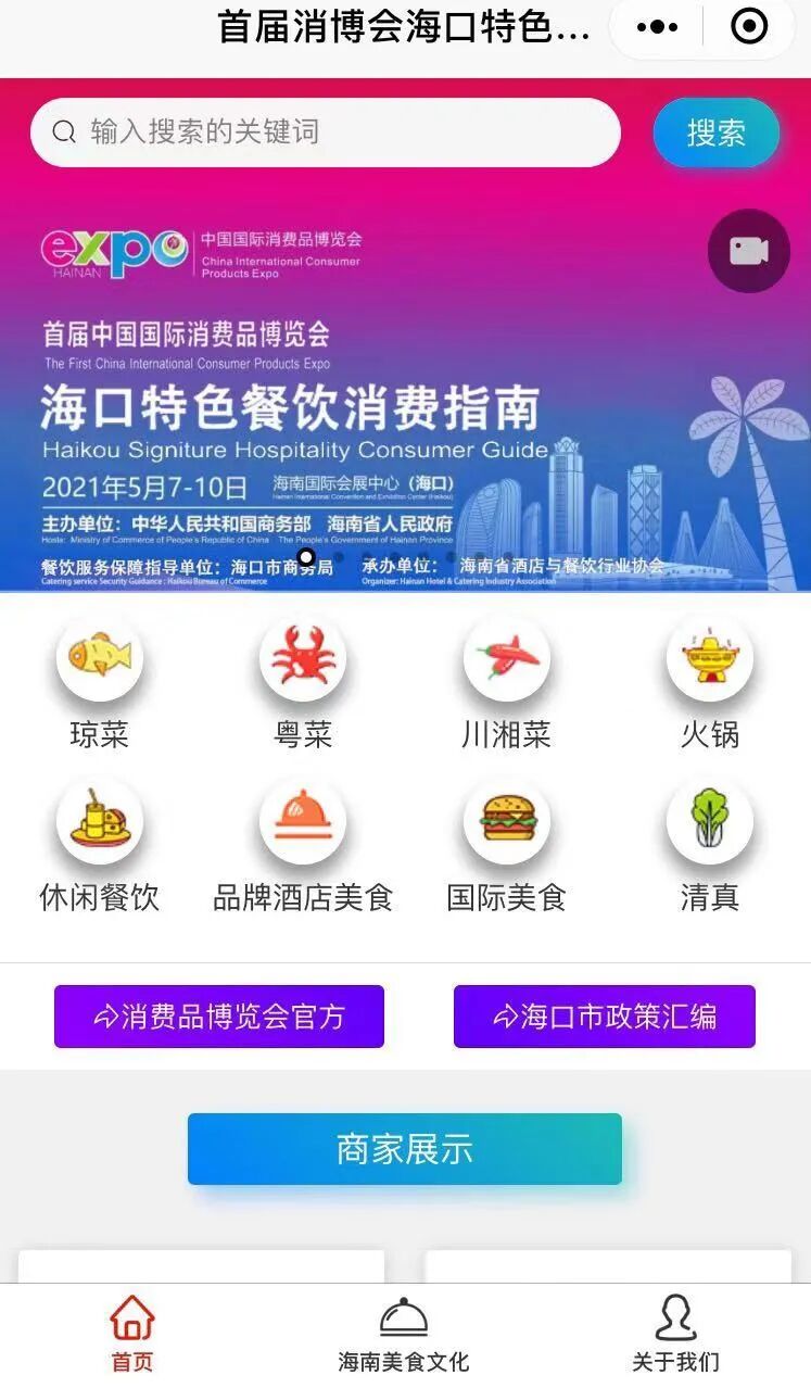 首届消博会餐饮促销费活动特别开设海口特色餐饮消费指南美食专属小程序,重点呈现馆内促销费商家及海口市各业态重点餐饮酒店企业餐饮促消费展示(内容含企业名称、地址、订餐电话、导航地址、包厢及座位量、菜品特色等)。