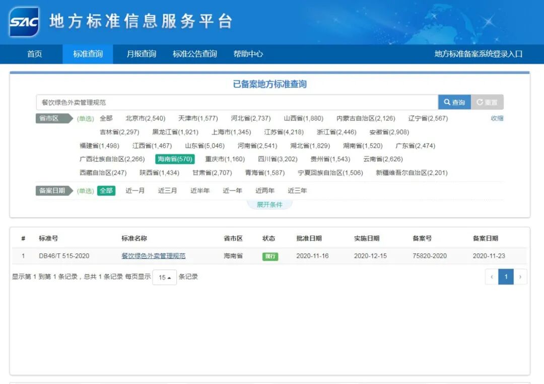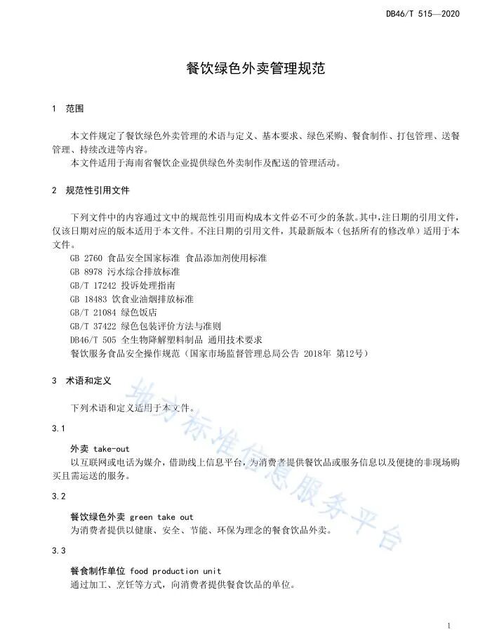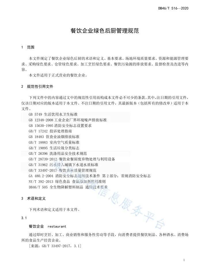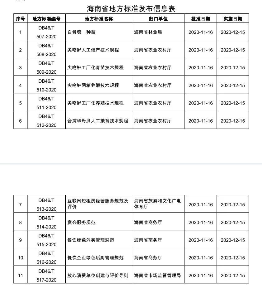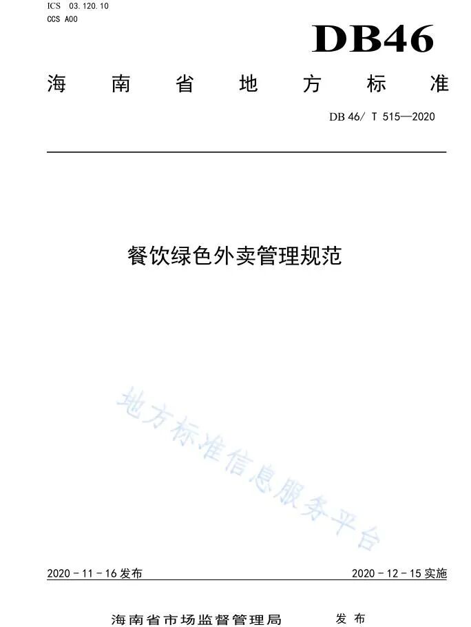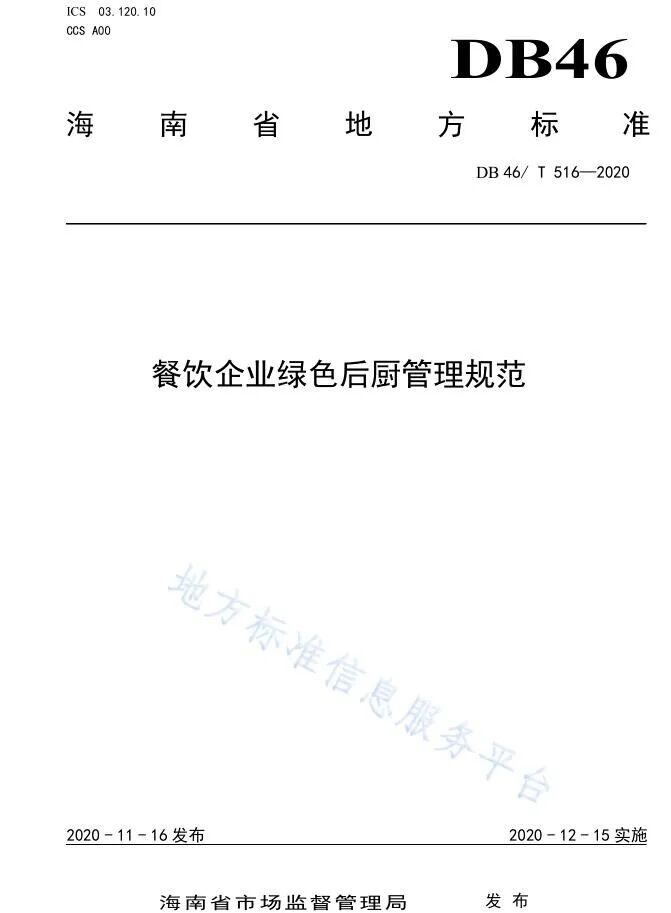 为落实海南省质量强省领导小组印发的《海南省绿色标准体系建设三年行动方案》(琼质强省〔2019〕1号)文件精神和海南省市场监督管理局《关于下达绿色标准体系地方标准项目制定工作计划的通知》(琼市监标函〔2019〕28号)文件要求,由海南省商务厅委托,海南省酒店与餐饮行业协会牵头组织行业专家共同编制的《餐饮企业绿色后厨管理规范》、《餐饮绿色外卖管理规范》,现已通过省市场监督管理局正式批准为海南省地方标准,并于“地方标准信息服务平台”全文公开发布: