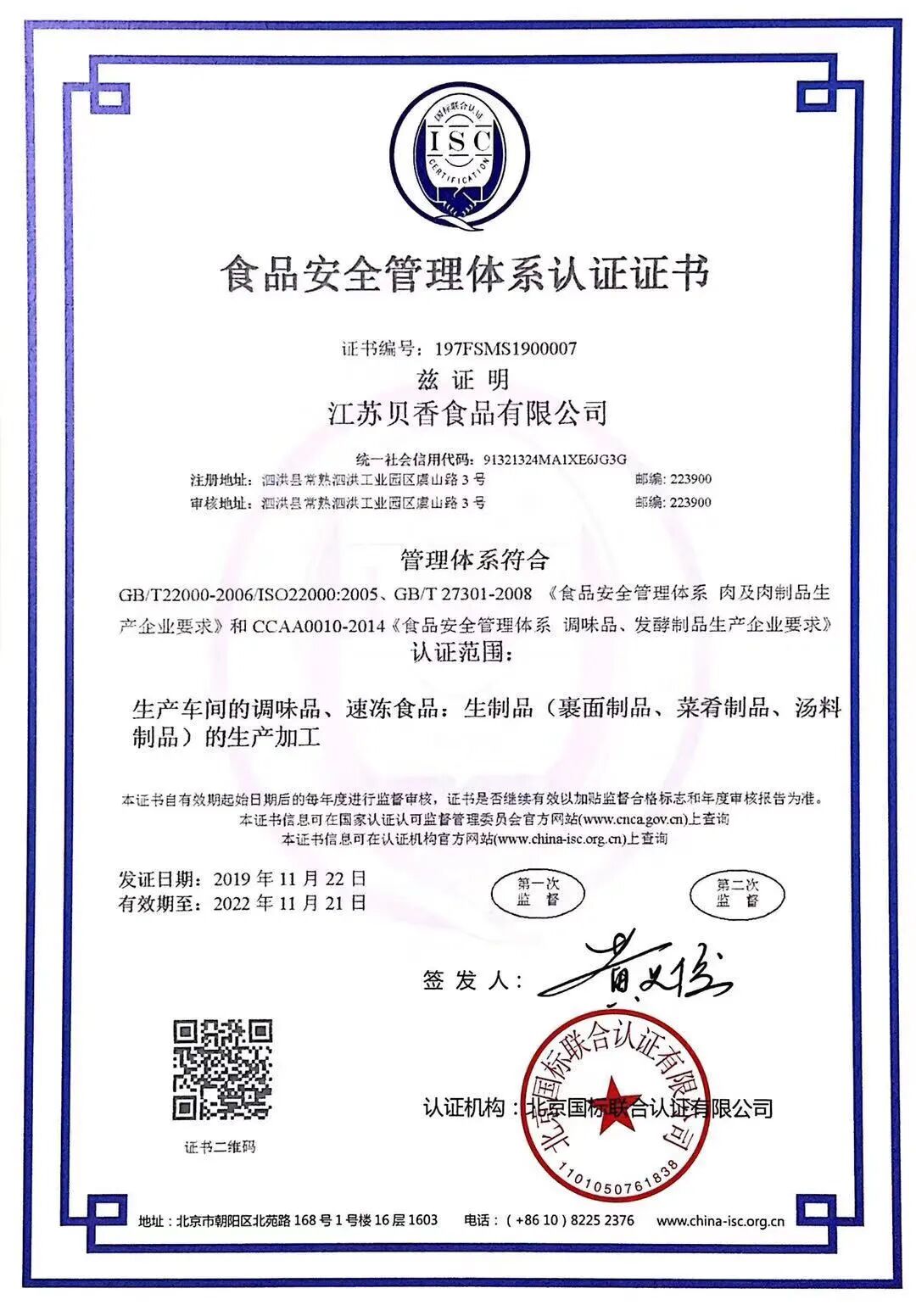 简介贝香食品成立于2016年,该公司通过1S022000食品安全管理体系认证IS...