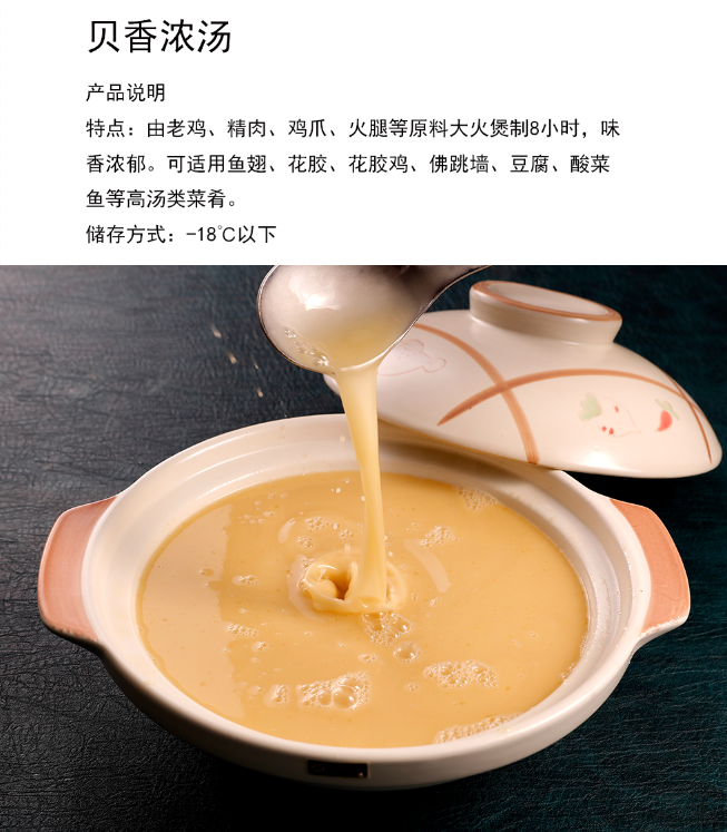 贝香食品成立于2016年,该公司通过1S022000食品安全管理体系认证IS09001食品质量管理体系认证。工厂占地面积30余亩,主要经营OEM定制速冻菜肴制品、速度汤类、调味品等,年产量万吨以上,是一家致力于从事研发和生产定制化餐饮产品的服务型企业。为客户提供一站式、定制化得餐饮服务解决方案,将原本个性化的社会餐饮美食利用科学的定制化开发手段和标准化的出品流程,实现从原材料加工到顾客餐桌的最佳定制型服务体验,销售佛跳墙伴手礼及餐厅佛跳墙浓汤、海参配送供应。