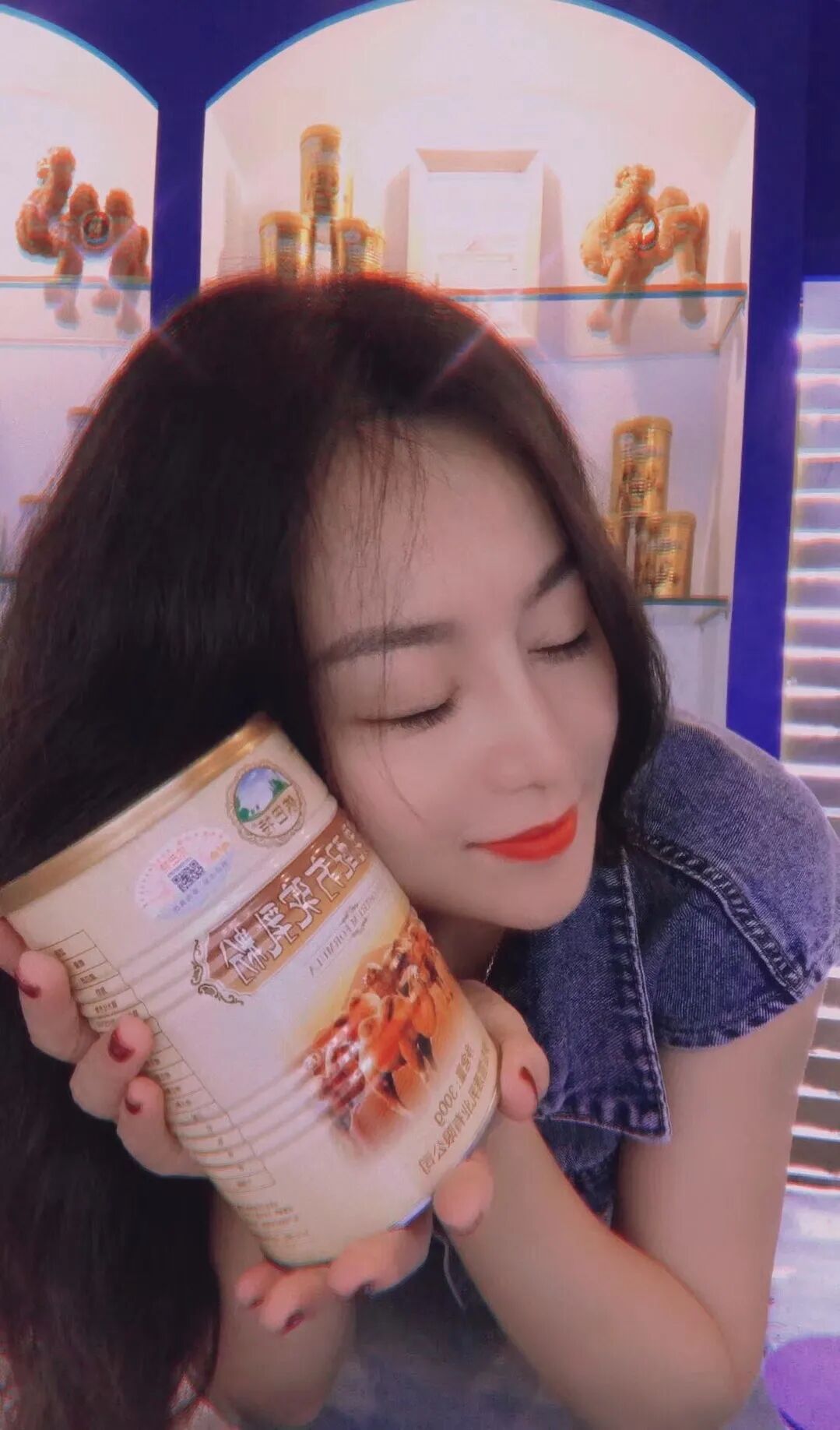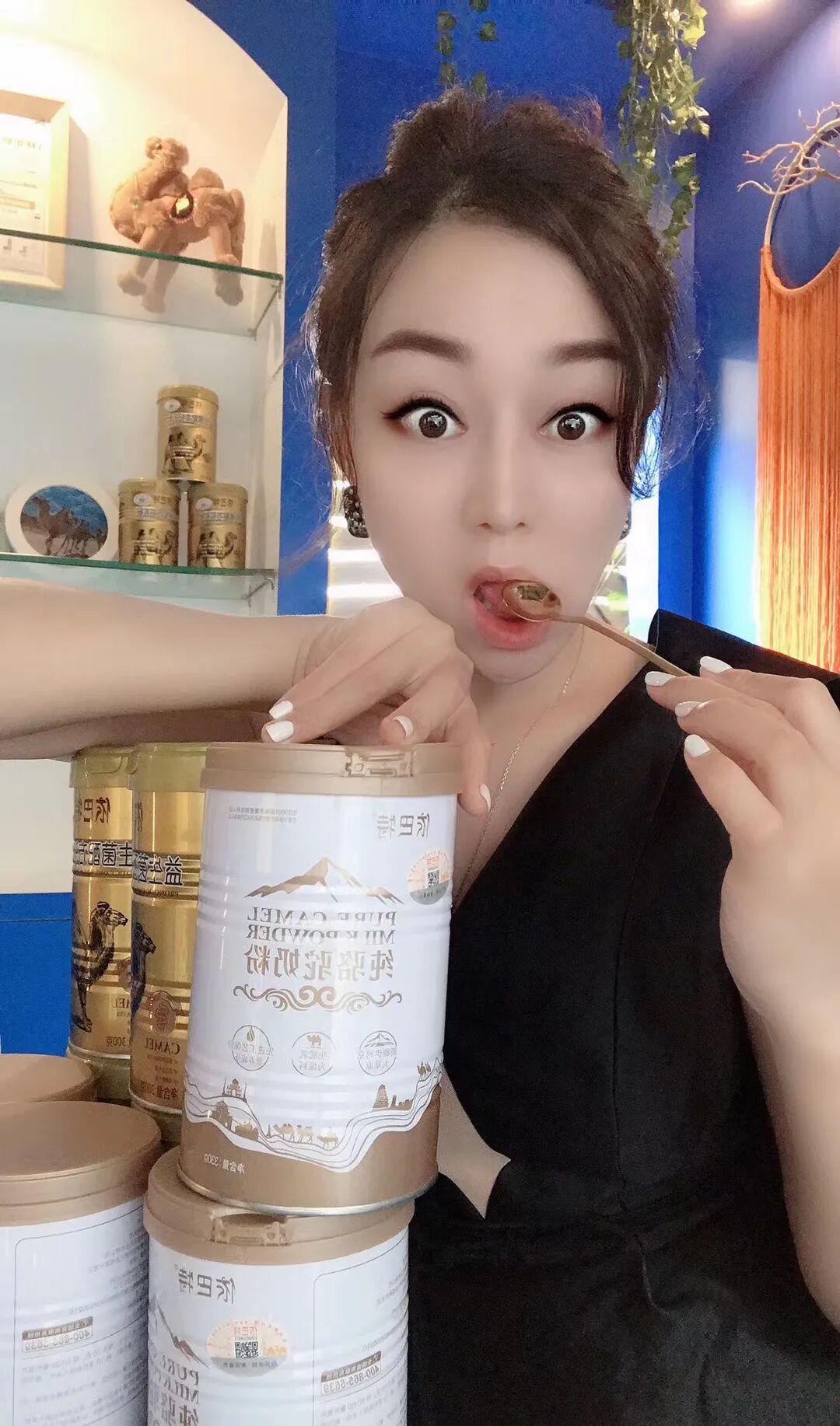 这是一家与众不同的依巴特网红店,网红时尚的装修风格,店内整体色调以蓝色为主,展示货架区域分明,货架上陈列着上千年的西域味道“依巴特骆驼奶”产品样式繁多,特色鲜明,浓郁的海城文化渲染了整个形象店的氛围。