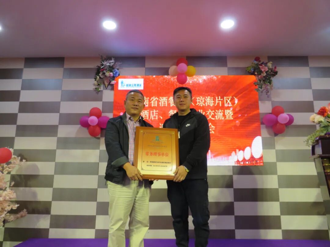 李果主席为新增选的协会理事会常务理事琼海嘉积永禾丰酒店用品有限公司总经理黄纳忱颁发证书和牌匾