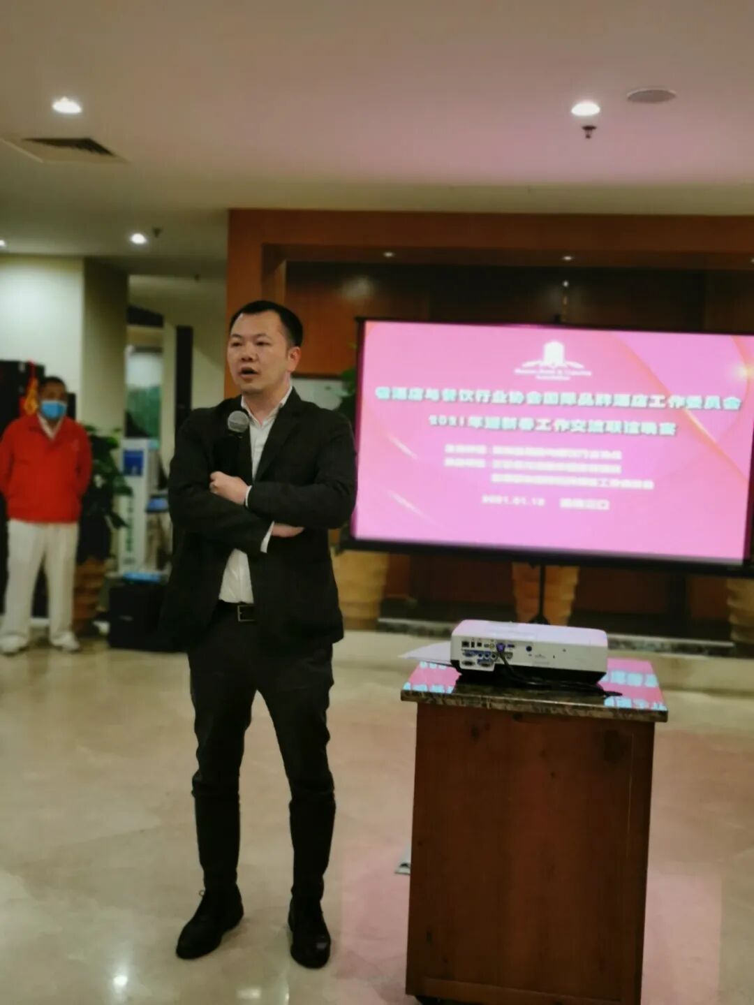 同时他指出,在过去的一年,也是我们酒店业痛苦和欣喜交加的一年,我们的酒店人在疫情面前坚守岗位、奉献爱心,在我们行业最危难的时候,体现了我们所有酒店人的职业道德和操守,也谱写了我们酒店人在酒店发展史上浓墨重彩的一笔。过去的一年协会坚守协会担当,及时发出战胜疫情的相关行业倡议,筹措抗疫物资奉献爱心,促进消费市场复苏,协会用实际行动诠释了服务社会、服务行业、服务企业的价值观。2021年是国家十四五规划的开局之年,也是海南自贸港积极推进的重要一年,海南自贸港法很快就要颁布,中央政府赋予海南独一无二的不可复制的政策,对我们海南酒店业的发展将带来更好的机遇和广阔的市场空间,特别是海南的特色旅游,如购物旅游、海洋旅游、康养旅游、教育旅游、体育旅游等都会迎来好的发展机遇。他相信在国家赋予的好政策、海南独特的地理区域优势和良好的自然环境下,海南的明天会更好,特别是海南酒店的明天一定会更加美好。